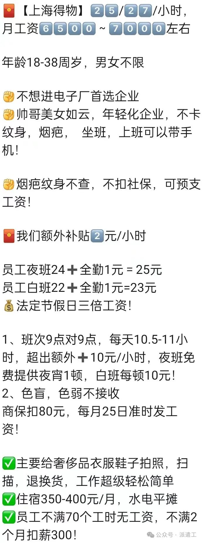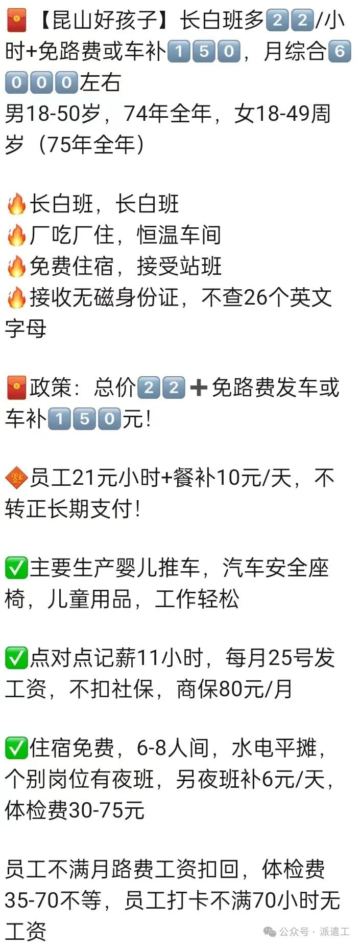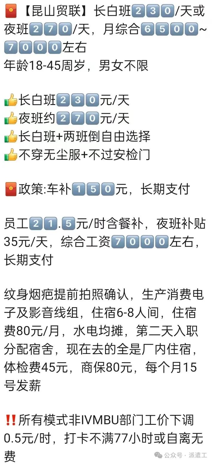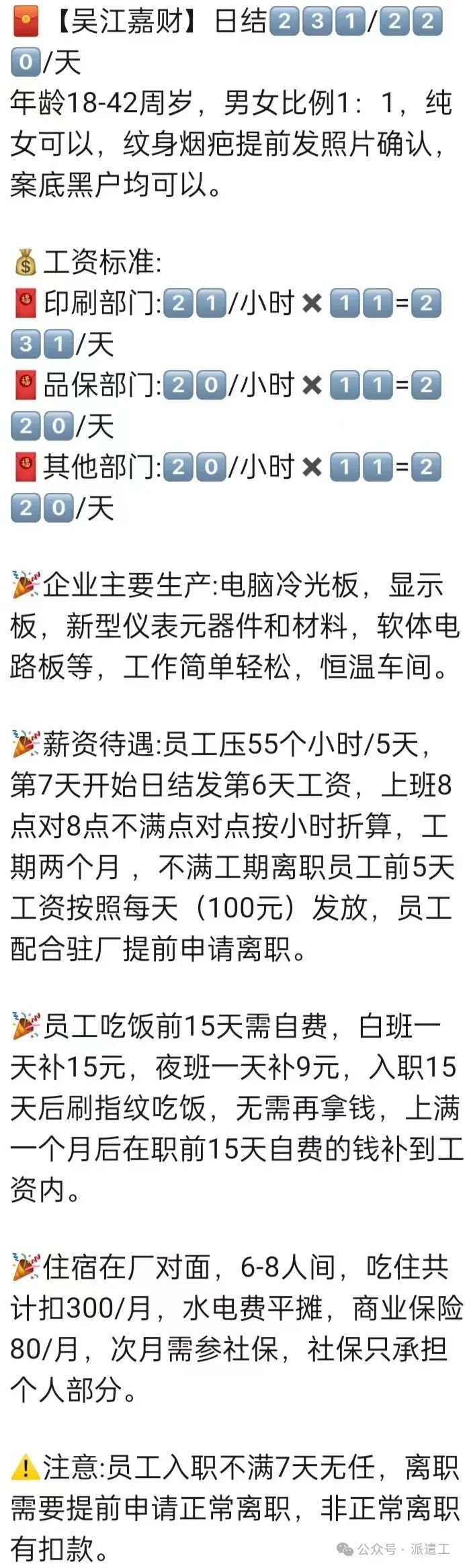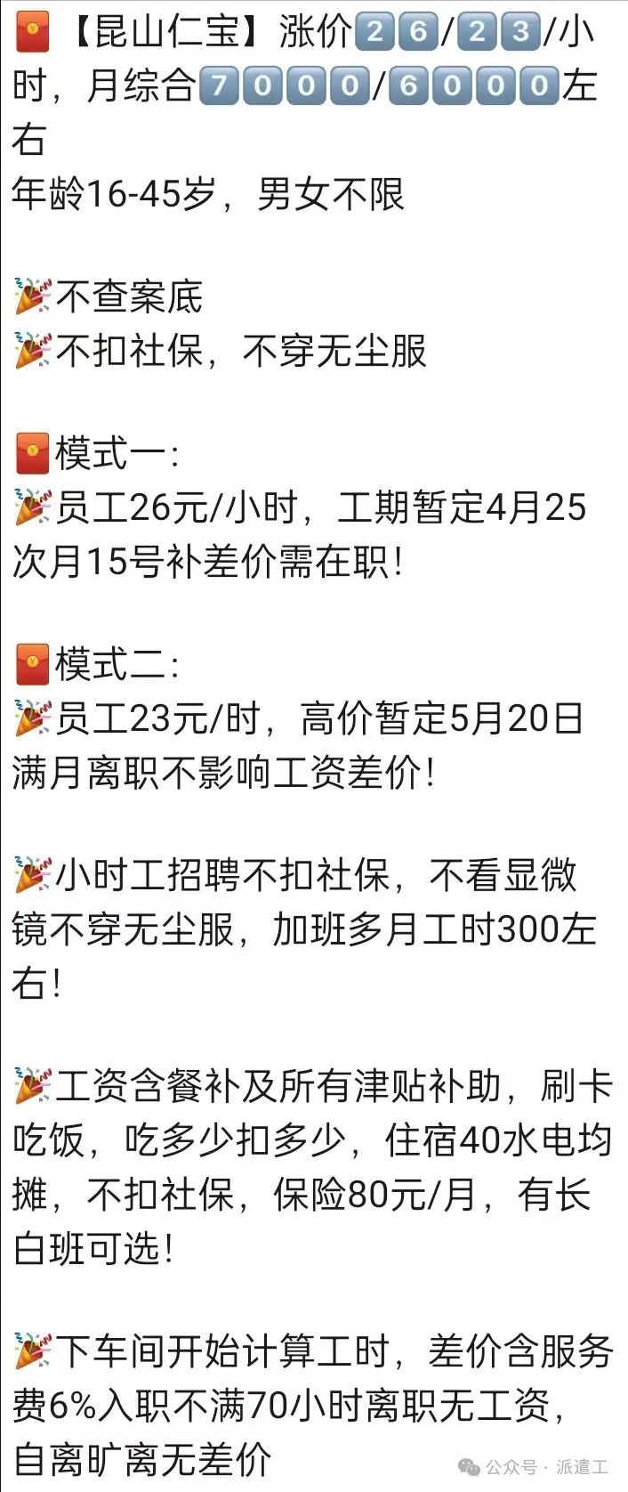 💰前60天员工打包价29元/小时(同工同酬工资+差价补贴)差价补贴需要满足员工差价补贴发放标准(以亿签网为准)【二次补贴】员工做满90天后,前60天按打包价29元/时(四川户籍27元),后30天按打包价20元/小时(四川户籍18元)一次性补足剩余差价,超出为个人所得,打包价包含同工同酬工资和厂区的所有补贴【面试当天算工期,旷自离无所有费用,入职后下产线计算工时,入职下产线后计算工时,离职需正常办理。】【特别说明】报备名单时按员工实际单价进行报备,禁止与员工私下再行约定返费,如有约定且隐瞒此消息,将承担给派遣公司造成的所有经济责任!2、工期满后根据厂区订单情况再具体出相关留任政策。2、身体健康,无明显纹身,体内不带金属(体检费50元,住宿钥匙压金20)5、提示!提示!所有人工友工资从下产线开始计算工时。【武汉富士康】