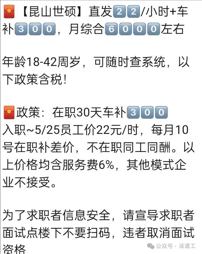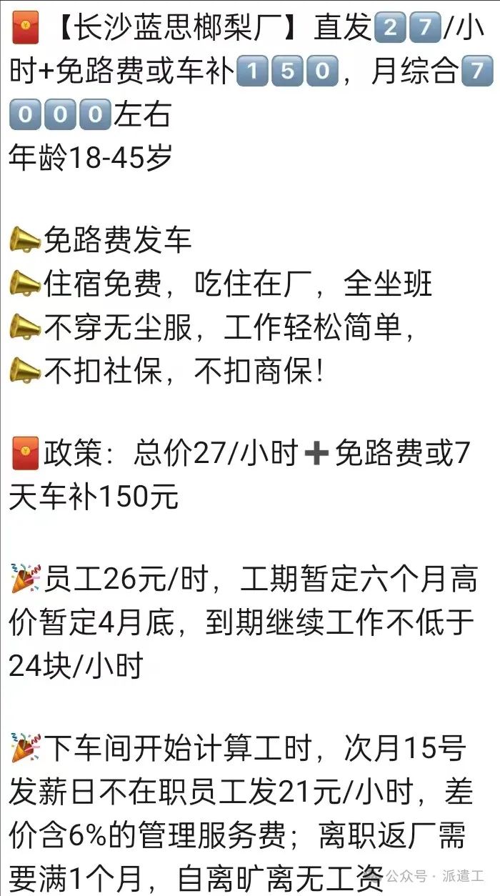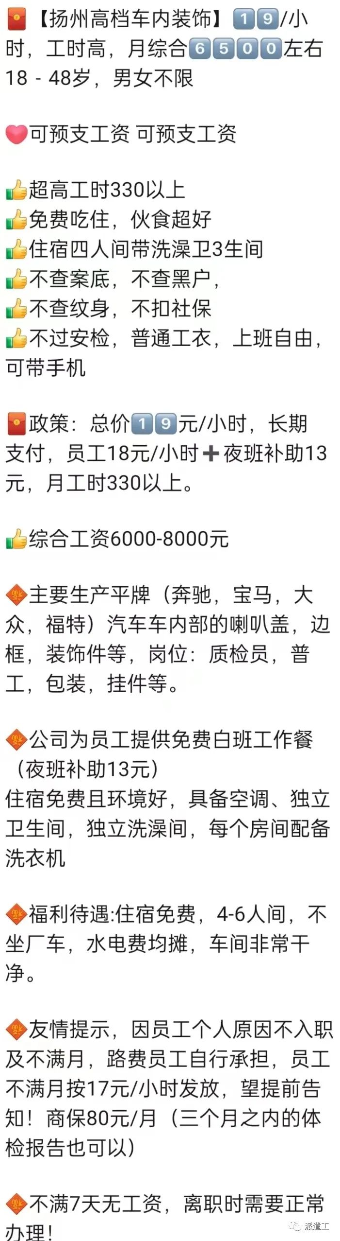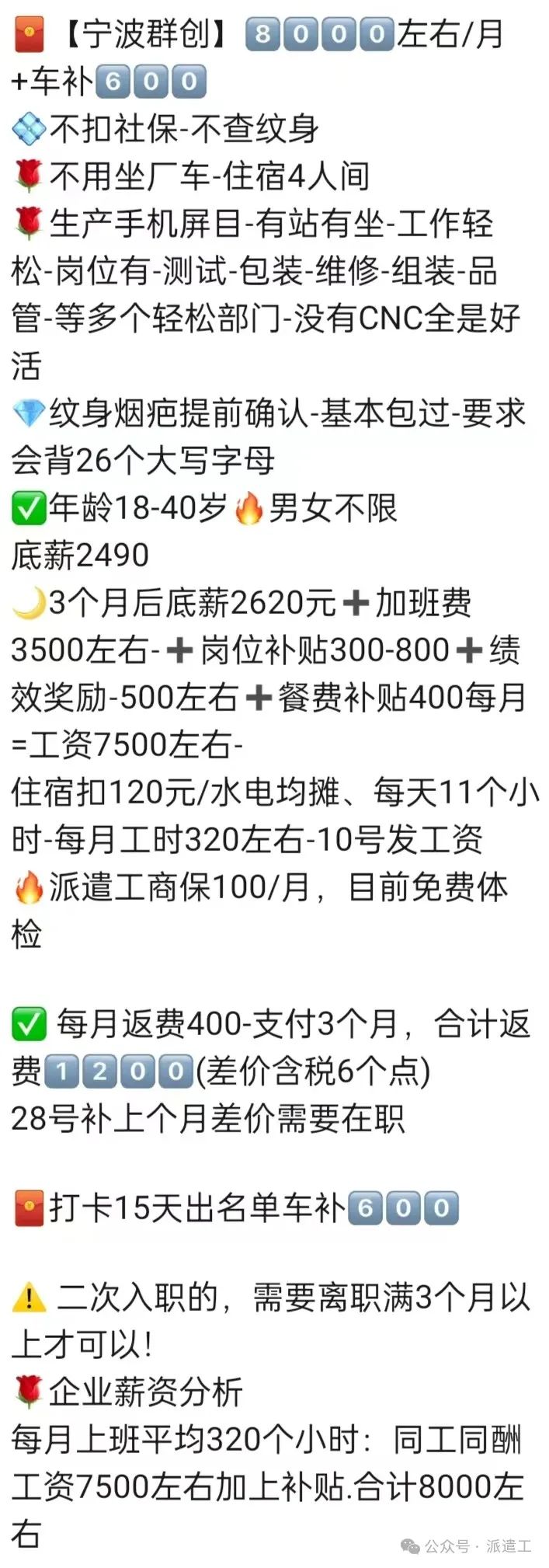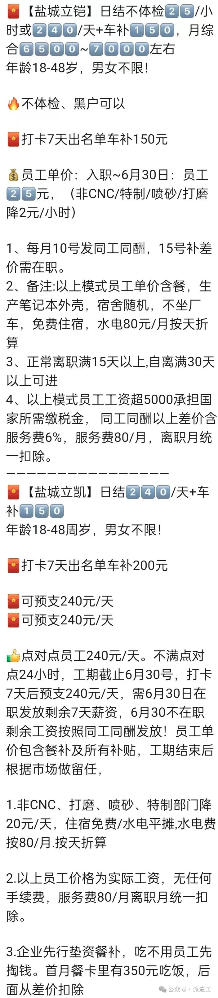 💰前60天员工打包价29元/小时(同工同酬工资+差价补贴)差价补贴需要满足员工差价补贴发放标准(以亿签网为准)【二次补贴】员工做满90天后,前60天按打包价29元/时(四川户籍27元),后30天按打包价20元/小时(四川户籍18元)一次性补足剩余差价,超出为个人所得,打包价包含同工同酬工资和厂区的所有补贴【面试当天算工期,旷自离无所有费用,入职后下产线计算工时,入职下产线后计算工时,离职需正常办理。】【特别说明】报备名单时按员工实际单价进行报备,禁止与员工私下再行约定返费,如有约定且隐瞒此消息,将承担给派遣公司造成的所有经济责任!2、工期满后根据厂区订单情况再具体出相关留任政策。2、身体健康,无明显纹身,体内不带金属(体检费50元,住宿钥匙压金20)5、提示!提示!所有人工友工资从下产线开始计算工时。【武汉富士康】
