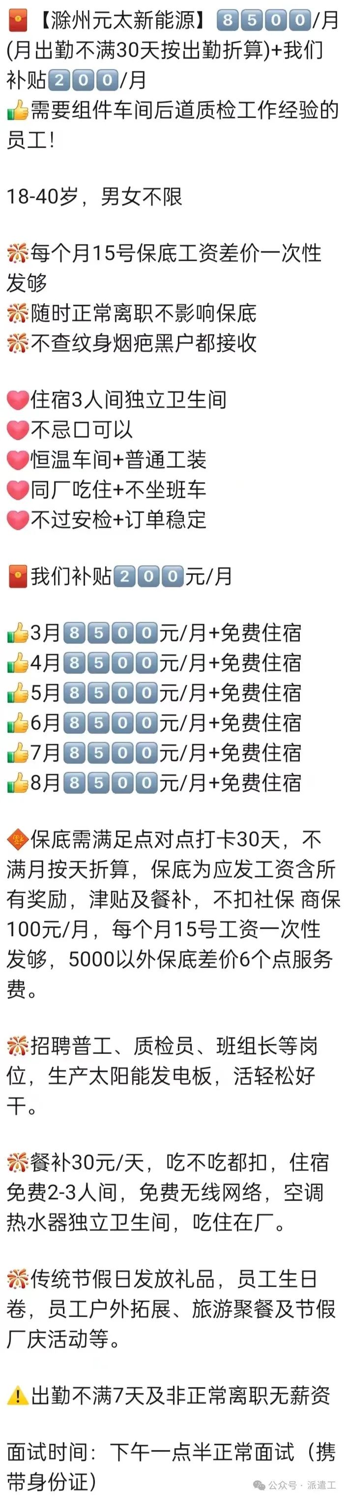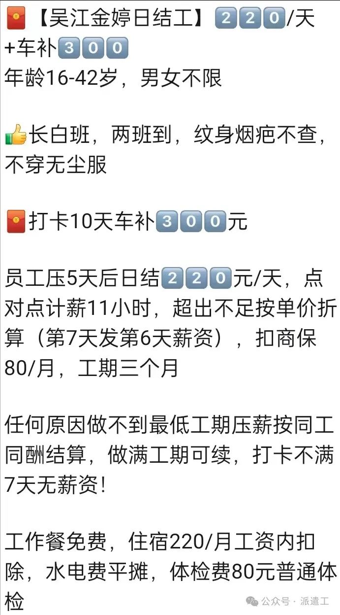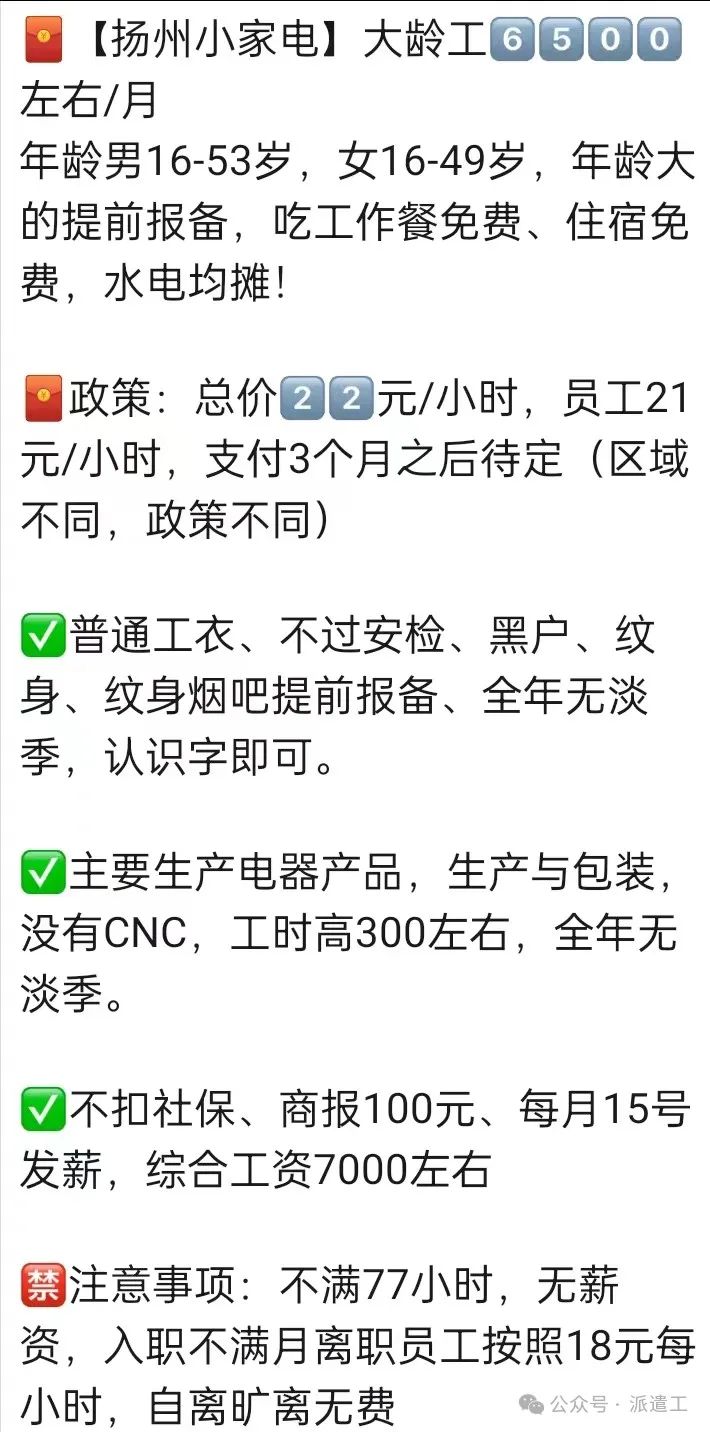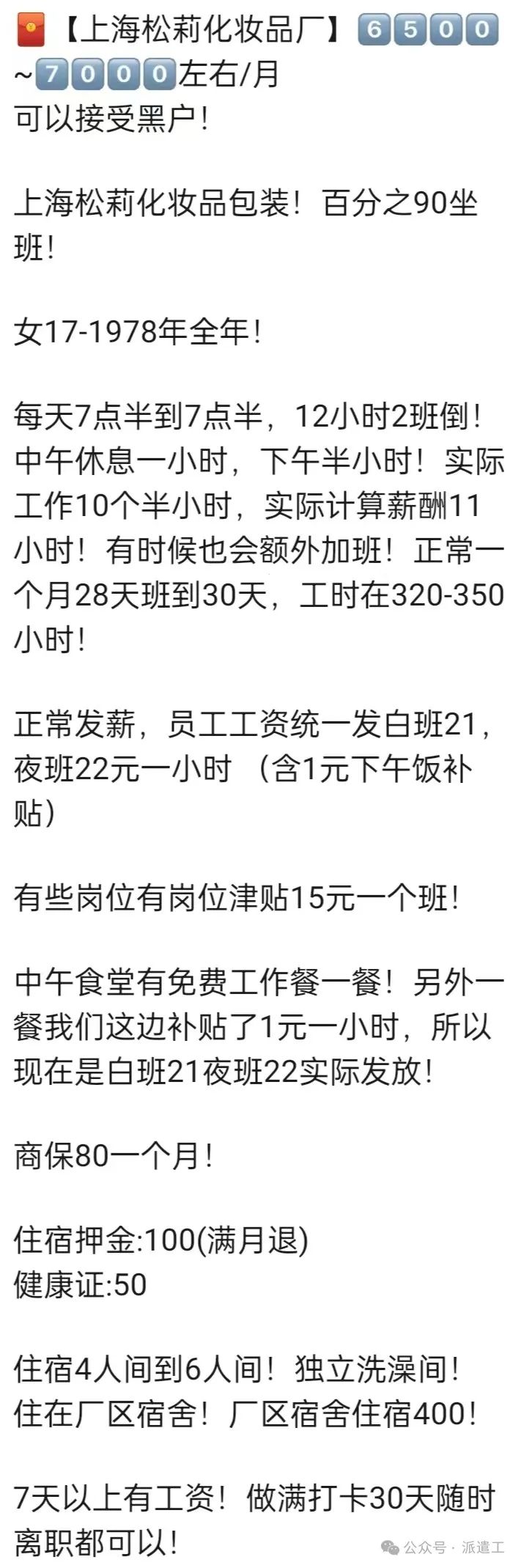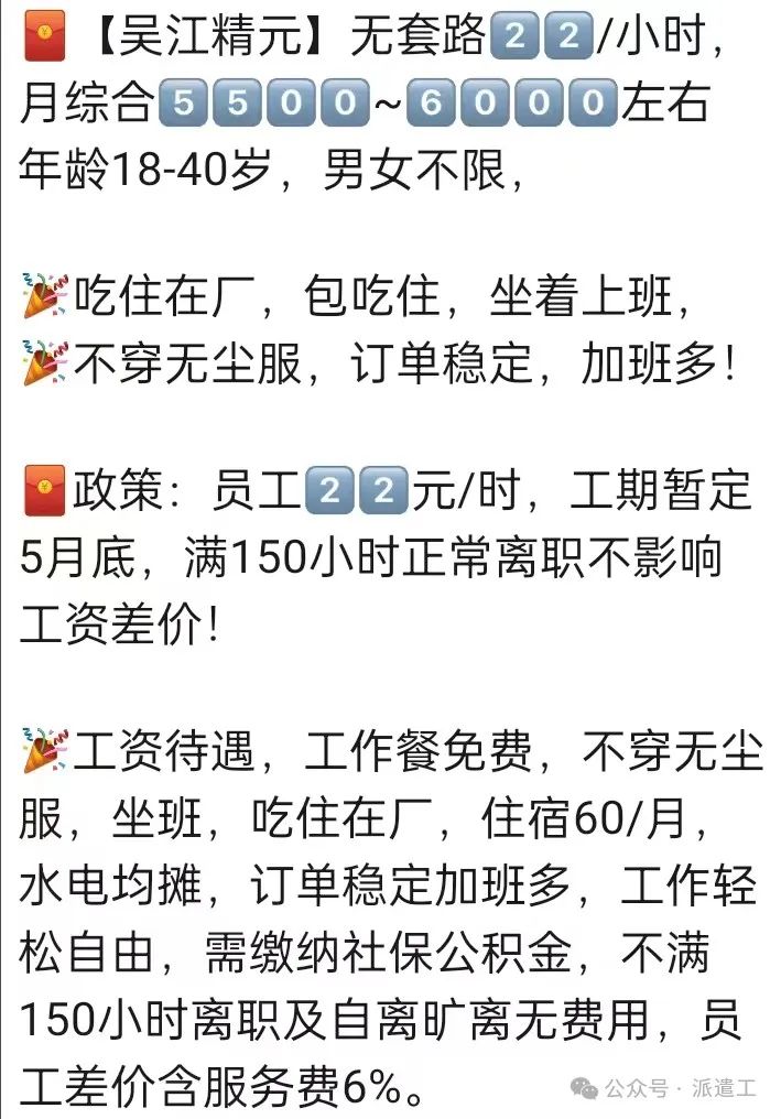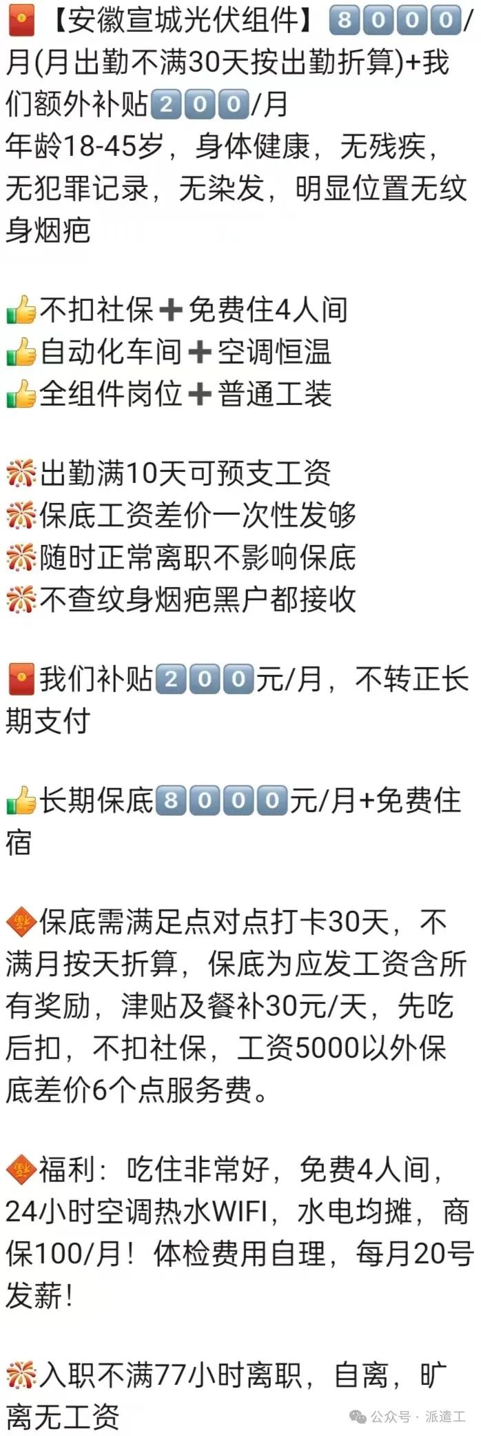 💰前60天员工打包价29元/小时(同工同酬工资+差价补贴)差价补贴需要满足员工差价补贴发放标准(以亿签网为准)【二次补贴】员工做满90天后,前60天按打包价29元/时(四川户籍27元),后30天按打包价20元/小时(四川户籍18元)一次性补足剩余差价,超出为个人所得,打包价包含同工同酬工资和厂区的所有补贴【面试当天算工期,旷自离无所有费用,入职后下产线计算工时,入职下产线后计算工时,离职需正常办理。】【特别说明】报备名单时按员工实际单价进行报备,禁止与员工私下再行约定返费,如有约定且隐瞒此消息,将承担给派遣公司造成的所有经济责任!2、工期满后根据厂区订单情况再具体出相关留任政策。2、身体健康,无明显纹身,体内不带金属(体检费50元,住宿钥匙压金20)5、提示!提示!所有人工友工资从下产线开始计算工时。【武汉富士康】