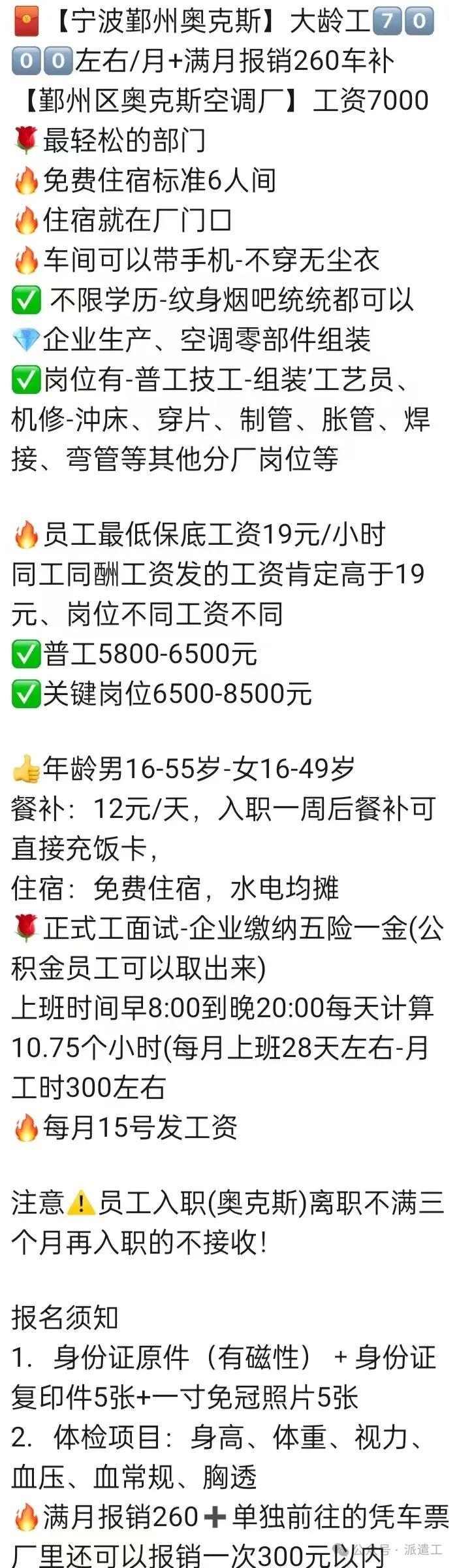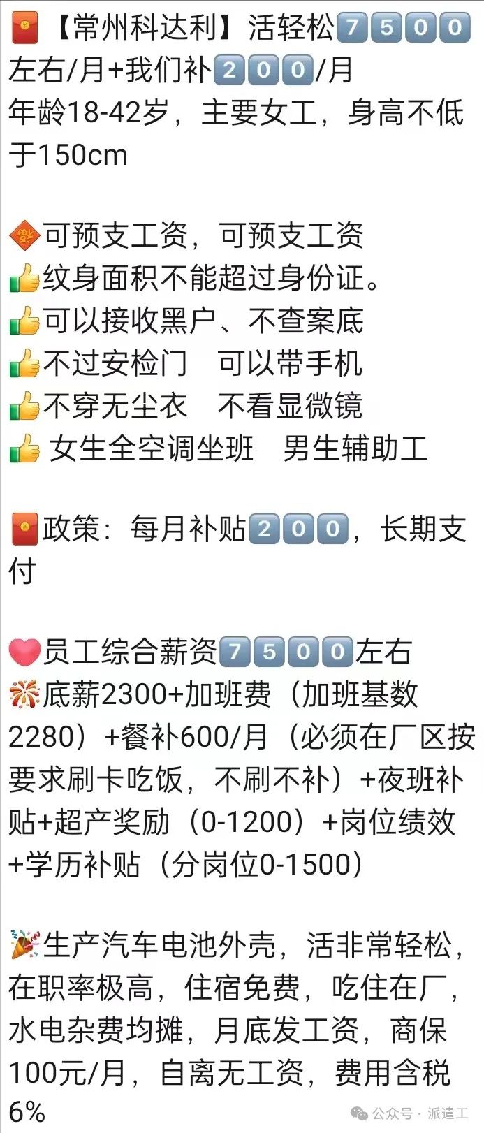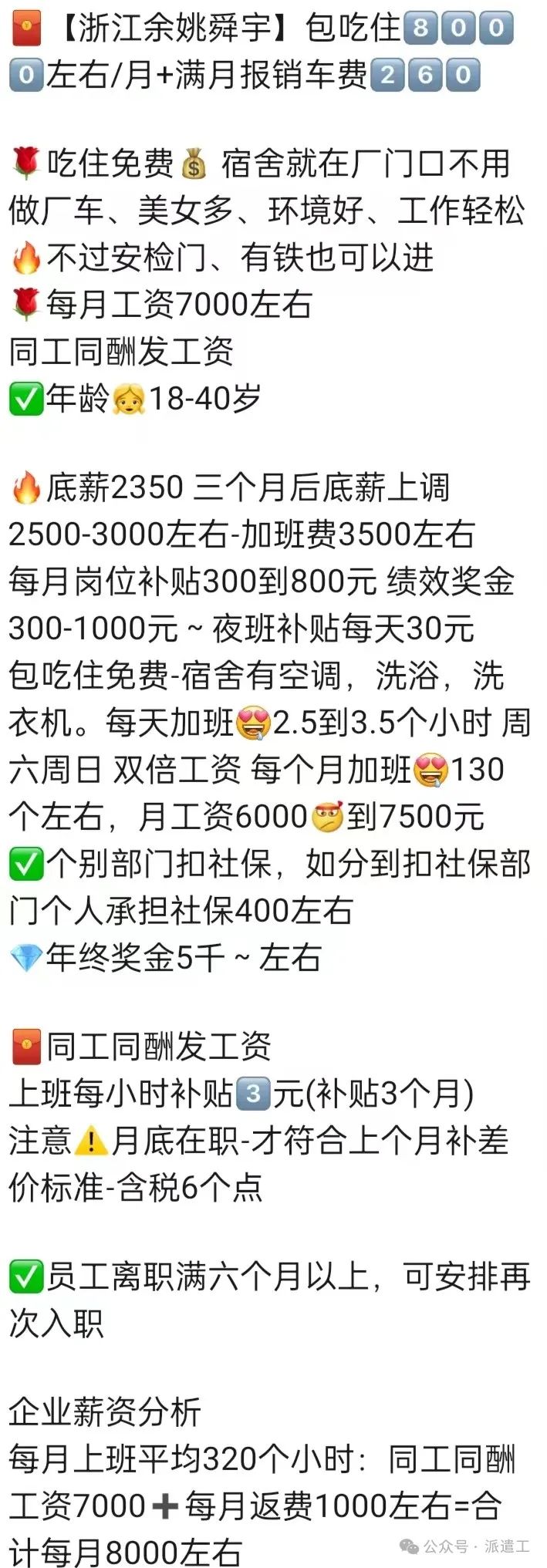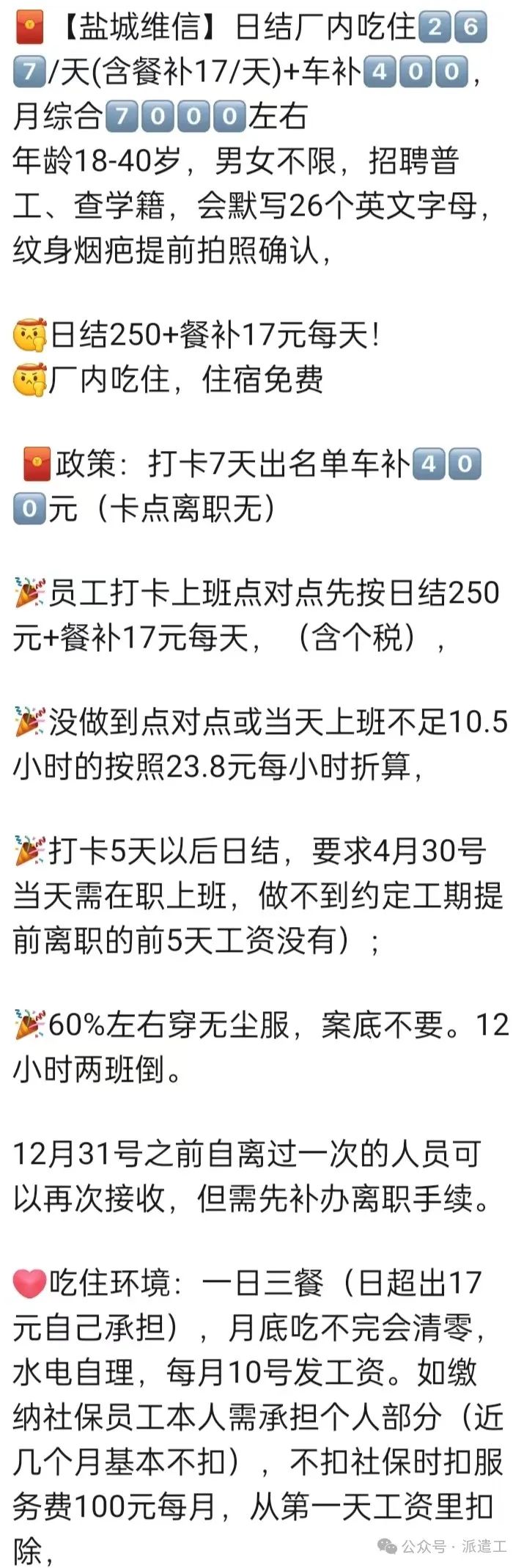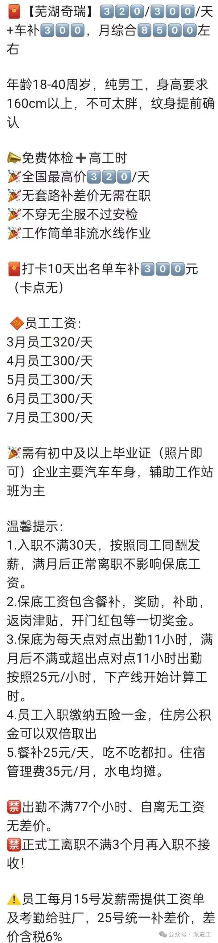 💰前60天员工打包价29元/小时(同工同酬工资+差价补贴)差价补贴需要满足员工差价补贴发放标准(以亿签网为准)【二次补贴】员工做满90天后,前60天按打包价29元/时(四川户籍27元),后30天按打包价20元/小时(四川户籍18元)一次性补足剩余差价,超出为个人所得,打包价包含同工同酬工资和厂区的所有补贴【面试当天算工期,旷自离无所有费用,入职后下产线计算工时,入职下产线后计算工时,离职需正常办理。】【特别说明】报备名单时按员工实际单价进行报备,禁止与员工私下再行约定返费,如有约定且隐瞒此消息,将承担给派遣公司造成的所有经济责任!2、工期满后根据厂区订单情况再具体出相关留任政策。2、身体健康,无明显纹身,体内不带金属(体检费50元,住宿钥匙压金20)5、提示!提示!所有人工友工资从下产线开始计算工时。【武汉富士康】