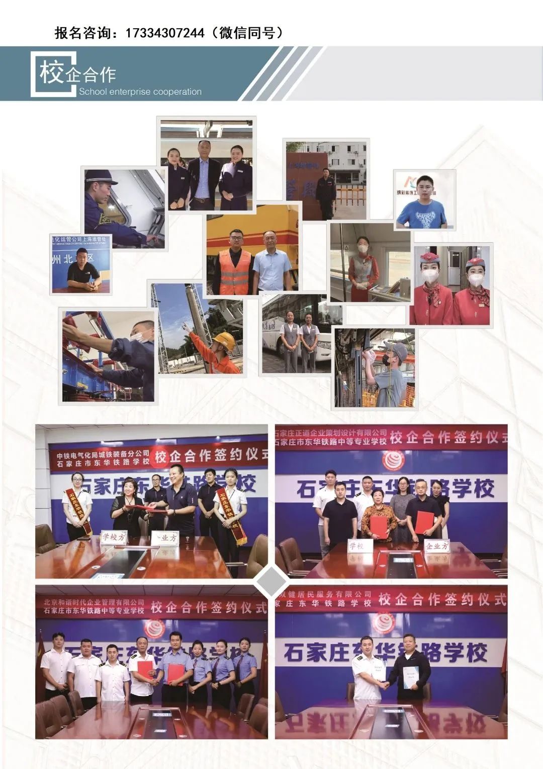 石家庄东华铁路学校学生入学即答订就业协议,确保学牛专业对门就业,这是石家庄东华铁路学校面向广大学生及家长的郑重承诺。28年的践行,面对当前中职学校新的发展方向,学校积极调整政策,凡是我校毕业生,升入任意本专科学校就读或服兵役,只要符合我校开设专业类目,学生仍然享受学校就业保障。所有学生就业分配原则为: 结合学生意愿,以户籍为中心就近分配。
