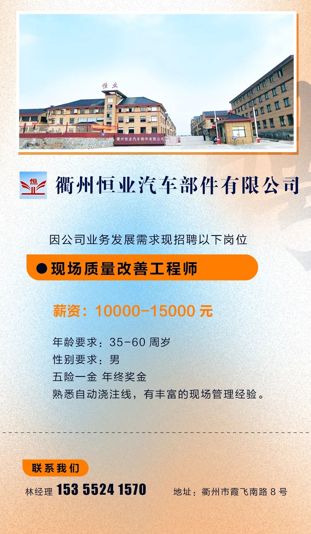 薪资待遇:10000-15000元/月,五险一金,年终奖金 衢州恒业汽车部件有限公司创建于2003年,注册资金11220万元,占地130亩,建筑面积5万多平方米。是一家以制造和销售汽车底盘配件、工程机械配件、建筑材料配件等铸造件为主的企业,公司位于衢州市东港工业园霞飞南路8号。 公司拥有日本新东FCMX-3水平分型全自动生产线两条,zz416A、zz418A垂直分型铸造自动线各一条,铁膜覆砂生产线一条,电泳线一条,手工铸造5000平方米,年铸造能力5万吨,另有各类高端加工设备150多台,年机加工零件产能达到1000万件的规模,具备强大的模具、工装、检具设计、制造能力。