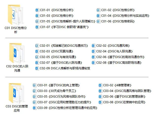 涵盖DISC性格分析、DISC与人际沟通和DISC的管理应用3大类
