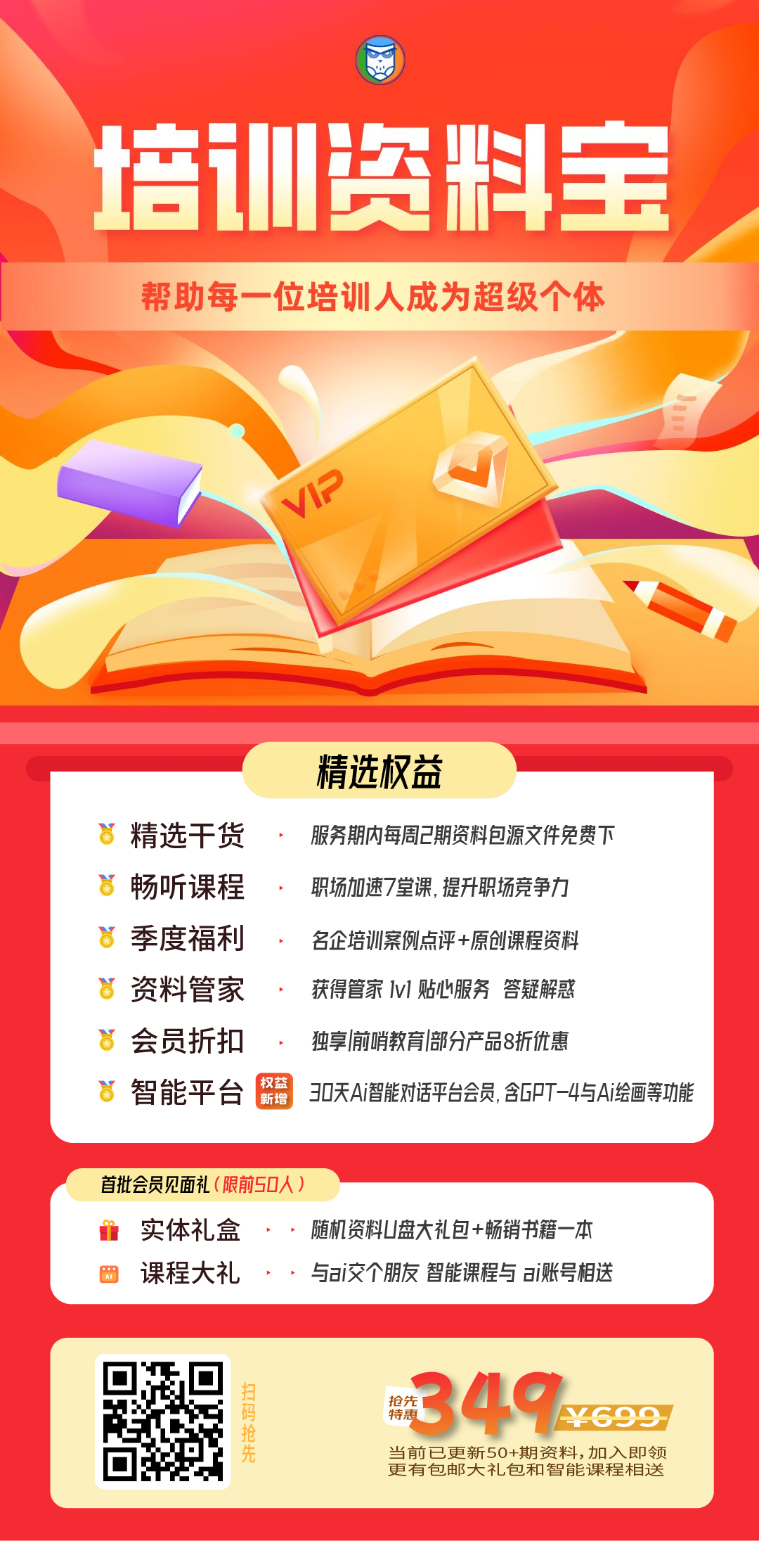 这80+页,共计超5万字的资料省去你自己开发培训内容的过程,直接应用即可让你产出更高质量的讲义文稿,节省大量时间与精力,提高工作效率。