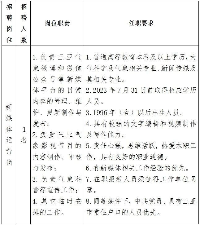 根据业务发展需要,海南天涯人力资源管理服务有限公司三亚分公司(以下简称“天涯人力”)招聘1名工作人员,派遣至海南省海南省三亚市气象局工作,具体招聘事项公布如下: