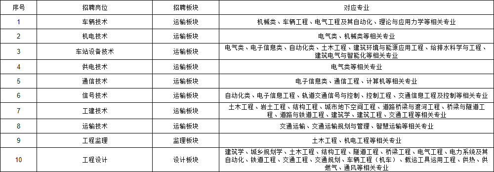 招聘板块包含运输板块、设计板块及监理板块等,具体岗位及对应专业详见下表。后续,还有职能类招聘岗位分批发布,请持续关注广州地铁官网招聘信息。