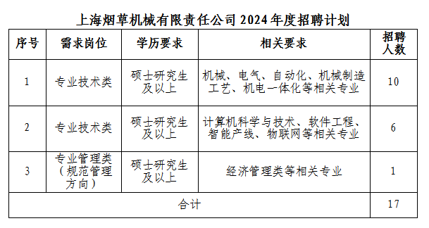 根据公司发展需要,上海烟草机械有限责任公司拟面向社会公开招聘17名2024届应届高校毕业生。现将有关事项公告如下: