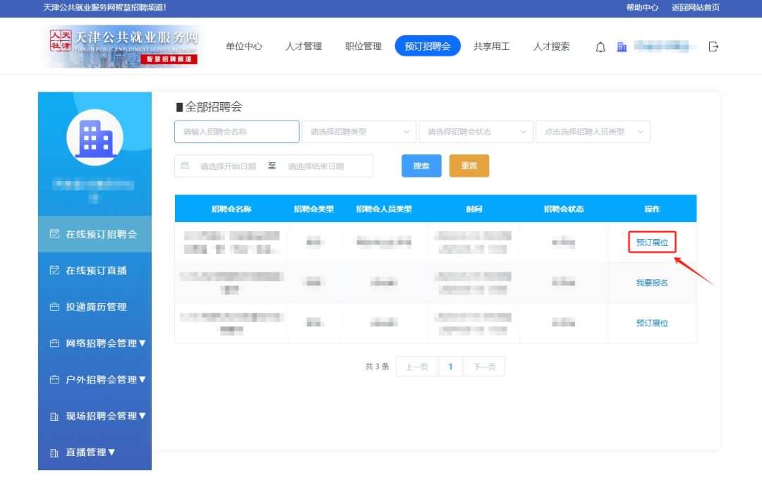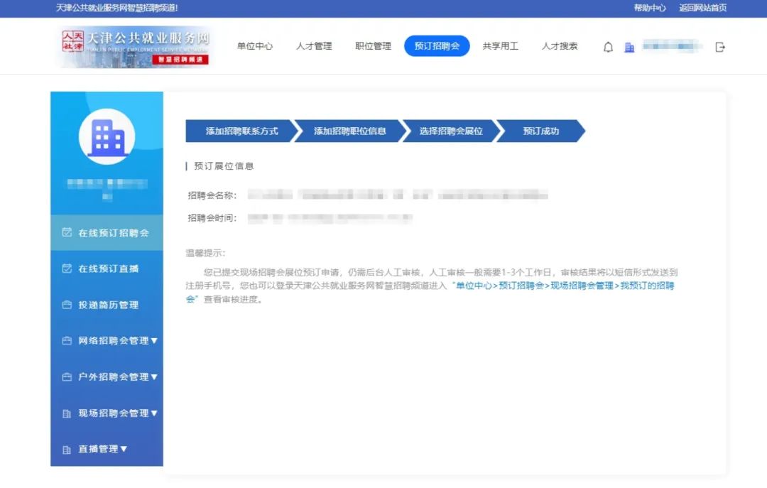 4、预定成功后,说明您已提交现场招聘会展位预订申请,仍需后台人工审核,人工审核一般需要1-3个工作日,审核结果将以短信形式发送到注册手机号,您也可以登录天津公共就业服务网智慧招聘频道进入“单位中心>预订招聘会>现场招聘会管理>我预定的招聘会”查看审核进度。