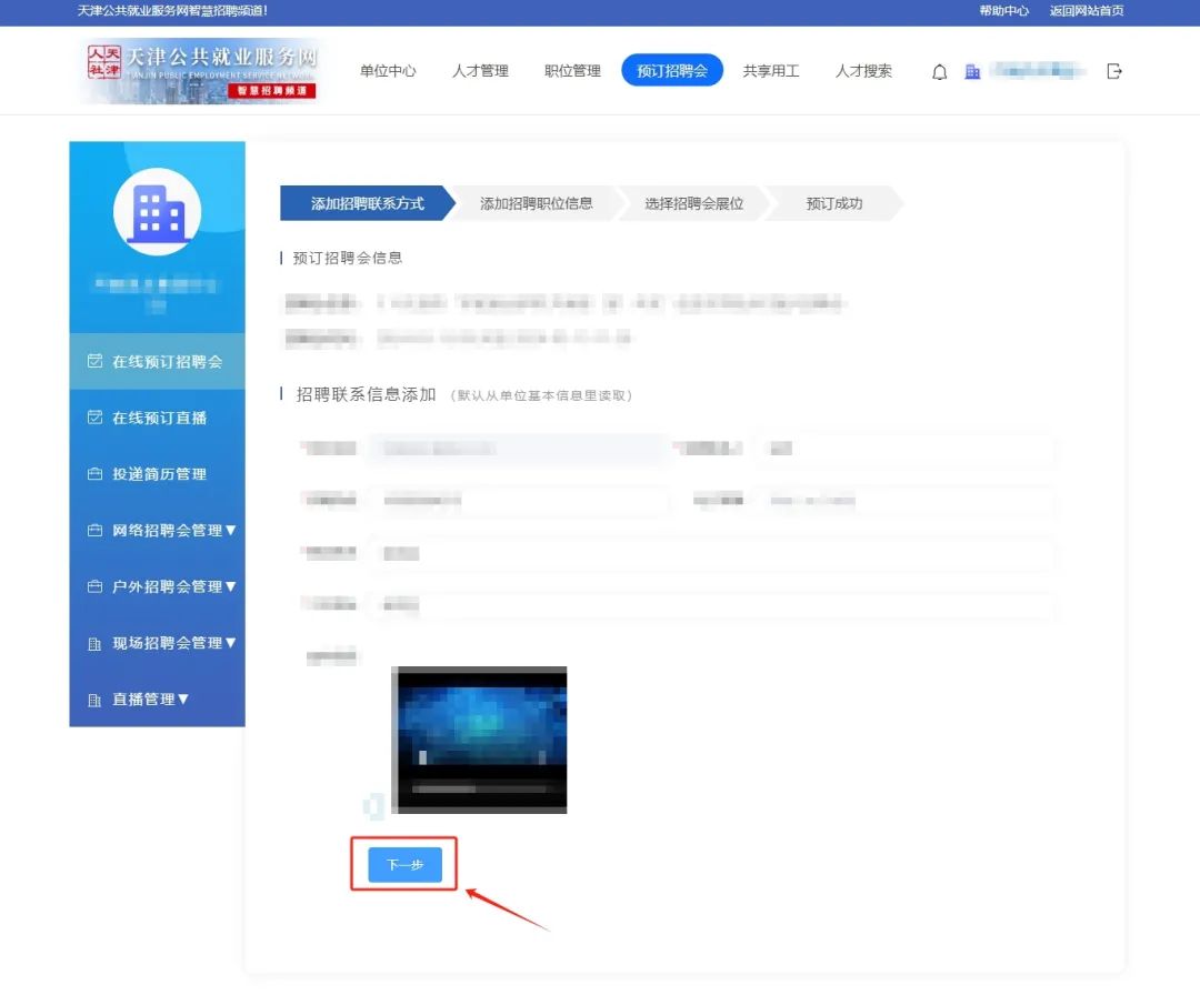 2、确认预定招聘会信息、添加招聘会联系方式之后,点击【下一步】。