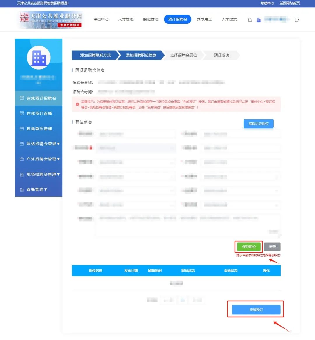 3、添加招聘会职位,然后点击【保存职位】,确认岗位信息后,点击【完成预定】。