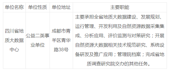 点击关注"宜宾市招聘" 根据《四川省省属事业单位公开招聘工作人员实施细则(试行)》(川人发〔2006〕34号)、《四川省人力资源和社会保障厅关于考核招聘地勘水文急需短缺专业技术岗位工作人员的通知》(川人社函〔2022〕528号)有关规定,四川省地质大数据中心拟面向全国公开考核招聘2名工作人员。现将有关事项公告如下。 一、单位基本情况  二、考核招聘对象、范围及基本条件 (一)考核招聘对象和范围 面向全国考核招聘符合《四川省地质大数据中心2024年公开考核招聘工作人员岗位和条件要求一览表》(以下简称《岗位和条件要求一览表》)(附件1)相关岗位条件要求和本公告其他要求的人员。 报考者须在2024年2月29日前取得符合岗位条件要求的毕业证、学位证、职称证等。未在规定时间取得并提供有关证书的,视为报考者自动放弃,责任自负。 (二)基本条件 1.报考者应同时具备的条件 (1)具有中华人民共和国国籍,热爱社会主义祖国,拥护中华人民共和国宪法,拥护中国共产党,遵纪守法,品行端正,有良好的职业道德,爱岗敬业,事业心和责任感强。 (2)身体健康,体检合格,能正常履行招聘岗位职责。 (3)具备本公告具体招聘岗位要求的条件和资格(详见《岗位和条件要求一览表》)。其中,报考者本人有效毕业证和学位证所载学历、学位和所获专业名称,应严格与拟报考岗位的“学历学位要求”和“专业条件要求”栏分别相符。 (4)符合条件的机关事业单位人员报考须征得所在单位同意。 (5)委培、定向毕业生,须征得原委培、定向单位同意。 2.有下列情况之一者,不得报考: (1)曾受过各类刑事处罚的。 (2)曾被开除公职的。 (3)被开除中国共产党党籍的。 (4)有违法、违纪行为正在接受审查的。 (5)按照《事业单位公开招聘人员暂行规定》和《四川省省属事业单位公开招聘工作人员实施细则(试行)》的相关规定应当回避的。 (6)尚处于国家和我省规定的最低服务期和试用期内的公务员、事业单位人员。 (7)按照《关于加快推进失信被执行人信用监督、警示和惩戒机制建设的意见》规定,由人民法院通过司法程序认定的失信被执行人。其他政策法规明确不得招聘为事业单位工作人员的失信人员。 (8)法律法规等规定的其他不能报考事业单位的情形。 三、报名 (一)报名方式 本次考核招聘采取现场报名方式,每人限报一个岗位,报考者应对报名资料的真实性、准确性和完整性负责。因提供不真实、不准确、不完整报名资料造成的责任由报考者自负。 此次公开考核招聘不收取任何费用。 (二)报名时间及地点 报名时间:2024年3月12日至3月14日,上午9:00-12:00,下午14:00-17:00。 报名地点:成都市青羊区青华路38号,4楼401室。 咨询电话:18982237821、18010631999
