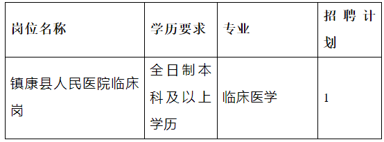 镇康县卫生健康系统2024年度事业单位急需紧缺人才引进公告为进一步加强卫生专业技术人才队伍建设,优化卫生人才队伍结构,经研究并报临沧市人力资源和社会保障局批准,镇康县人民医院决定面向全国招聘1名事业单位急需紧缺专业人才,现将招聘相关事宜公告如下:2024年毕业的全日制普通高校本科并取得学士学位及以上学历的毕业生。(二)引进招聘人数及岗位条件(见下表) 2.拥护中华人民共和国宪法、拥护中国共产党领导和社会主义制度;3.年龄在18周岁及以上、35周岁及以下,对于2024年应届硕士、博士研究生(非在职人员),放宽到40周岁及以下(年龄计算截止日期为发布公告报名之日);4.具备良好的政治素质和道德品行,热爱卫生健康事业;5.具有正常履行职责的身体条件和心理素质;6.具备招聘岗位所需的年龄、学历、学位、专业和技能;7.符合招聘岗位要求的其他资格条件。1.受到党纪、政纪处分期限未满或者正在接受纪律审查的人员,被开除中国共产党党籍的人员;2.受到刑事处罚期限未满或者正在接受司法调查尚未做出结论的人员,有违法违纪嫌疑正在接受审查的人员;5.各级公务员招考和事业单位招聘中被认定有舞弊等严重违反考录、招聘纪律行为的人员;6.参加公务员招考和其他各类事业单位招聘被确定为拟录用(聘用)的人员;8.法律法规和政策规定不得聘用为事业单位工作人员的其他情形的人员。紧缺人才招聘公告在“镇康县政府公众信息网”(www.ynzk.gov.cn)发布。公告期不少于7天,并适时发布在“健康镇康”“镇康县紧密型医共体总医院”公众号以及各相关微信群、QQ群。2.报名流程:将身份证、学籍证明、毕业生就业推荐表、在校期间学习成绩单(须盖有学校教务处公章)、个人简历等材料现场提供到报名处,并填写报名登记表。3.报名时间及地点:以《云南省2024年医药类高校毕业生招聘会昆明医科大学专场公告》为准。4.报名资格审查:由此次招聘工作小组对报名者的所有资料进行审核。资格审查贯穿引进急需紧缺专业技术人才工作全过程。报考人员报名时提交的信息和提供的有关材料必须真实有效,一经发现不符合条件、弄虚作假或违反相关规定的,将取消其笔试、面试、聘用资格,由此产生的一切后果由个人承担。1.由招聘小组在昆明医科大学组织专业技能考试(闭卷考试),笔试内容包括基础医学、临床医学、医学人文、预防医学等综合内容。2.通过资格审查的报名人数与拟招聘人数的比例应不低于3:1,达不到规定比例的岗位,须报县人力资源和社会保障局同意后方可组织笔试。3.笔试时间及地点:具体地点及时间根据实际情况现场及电话通知。2.面试以面试官提问的方式进行,主要考察应聘人员专业技能及适应岗位要求的业务素质与工作能力等。 3.面试时间及地点:具体地点及时间根据实际情况现场及电话通知。考生综合成绩=笔试成绩×50%+面试成绩×50%,研究生在考试总成绩的基础上加2分。笔试成绩、面试成绩和综合成绩四舍五入后保留至小数点后2位。如出现综合成绩相同,则按面试成绩从高到低的顺序优先确定。若笔试和面试成绩二者都相同,按照优秀学生干部、优秀毕业生、镇康籍毕业生等条件优先确定拟聘人员。与拟聘用人员当场签订《镇康县专门公开招聘急需紧缺专业技术工作人员协议书》。待签订协议对象毕业后在规定时间内携带报考岗位要求提供的毕业证、学位证原件和复印件各1份到镇康县卫生健康局进行资格复审,未能提供相关证书原件的资格复审不予合格。因资格复审不合格出现名额空缺,按拟聘对象面试成绩由高到低依次递补。1.体检标准及项目参照公务员录用体检的有关规定执行,费用自理。体检不合格者不得进入聘用环节。因考生自动放弃体检或体检不合格形成的空缺,可从报考同一职位并参加面试的人员中,按面试成绩从高分到低分的顺序依次递补。2.体检相关事宜将通过电话通知本人,请考生保持联系方式畅通。1.体检合格后,将在镇康县人民政府门户网站进行不少于7个工作日的公示,接受社会监督。2.公示期满后,没有反映问题或反映有问题但不影响聘用的,办理聘用手续;对反映有影响聘用的问题并查有实据的,不予聘用;对反映的问题一时难以查实的,可暂缓聘用,待查清后再决定是否聘用。为保护考生权益,反映问题时原则上要求实名反映,否则不予受理。3.经公示无异议,拟引进人员按程序报县人力资源和社会保障局审批,并办理相关聘用手续。拟聘用人员在接到聘用通知后,须在规定时间内持相关材料到用人单位报到。无正当理由逾期不报到者,取消其聘用资格。(一)应聘人员须服从国家和省的招聘政策规定,提供符合规定并与招聘岗位相符的证件,对违反纪律的人员,视情节轻重,取消应聘资格。招聘工作人员存在应当回避的情形或可能影响招聘公正的,应当回避;如有违反招聘纪律、徇私舞弊行为的,按有关规定给予严肃处理。本次招聘工作在县人力资源和社会保障局全程指导和县纪委监委全程监督下进行。(二)应聘人员在报名时提供的信息资料必须真实有效,届时若有资料信息与事实不符的人员,查实后将不予聘用。(三)对违反招聘纪律、弄虚作假隐瞒真实情况的应聘人员,取消聘用资格。咨询电话:镇康县卫生健康局 0883-3060957联 系 人:杨老师 联系电话:18487224327监督电话:镇康县人力资源和