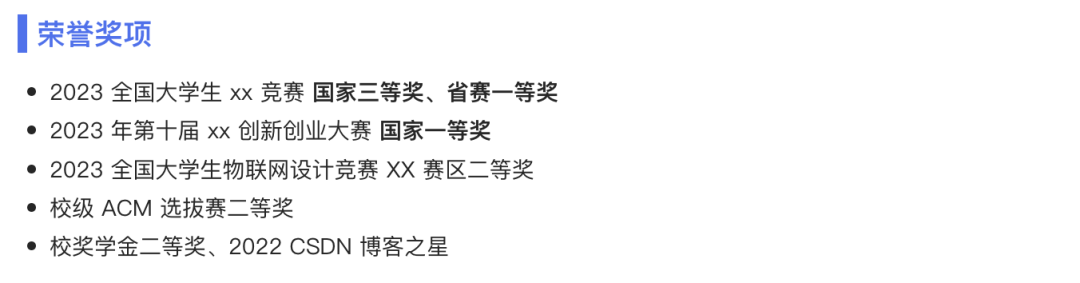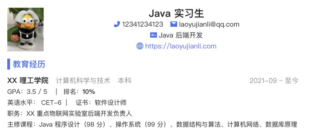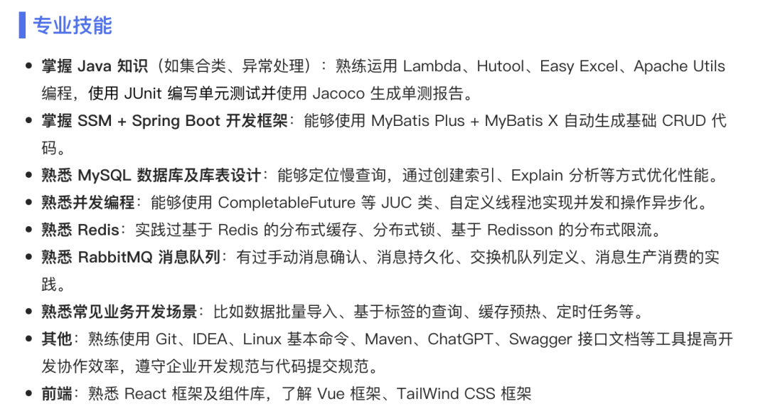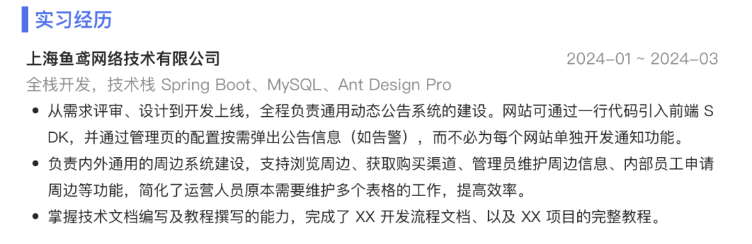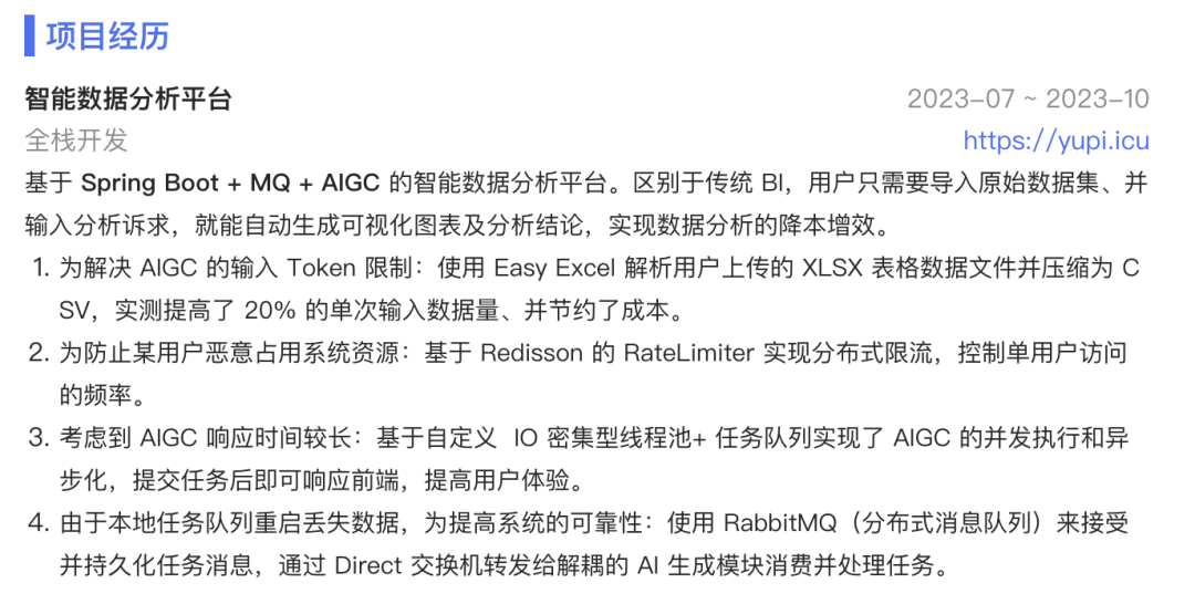 1、个人信息和教育经历如图: ![]() 这部分内容不要占用过多的空间,几行就可以了。 个人照片必须是标准证件照,不能是生活照!这里鱼皮为保护当事人隐私,随便找了张图片而已~ 主修课程那里其实是鱼皮优化过的,本来还写了更多课、而且也没有相应的分数。 鱼皮的建议是:本身就是计算机相关专业(或者专业和求职岗位相匹配)的同学不用再占用空间去写自己的主修课程了,因为学校教的内容往往比较基础、而且面试官默认这个专业或者投递这个岗位的同学都应该会这些课,写上去也没有什么优势。 但是建议非计算机相关专业(或者专业和求职岗位不匹配)的同学适当列举关键主修课程,优先列举和求职岗位相关的、取得分数较高的课。 如果有得分较高的课程(比如 90 分以上),可以在课程名后用括号补充分数。 2、荣誉奖项如图: ![]() 这位同学的经历还是比较丰富的,而且对奖项进行了排序,以及对关键词进行了加粗,这点非常好。 建议大家也像他一样,优先把认可度高的、参赛范围广的、获奖级别高的、和求职岗位更相关的奖项放上面,一些不知名的竞赛放到下面或者合并去写。 他的荣誉奖项模块占用的篇幅比例其实有点过多了,可以再节约一些空间,2 ~ 3 行就够了。 3、实习经历如图: ![]() 那必然是我们公司的实习哈哈!实习经历的核心是突出自己的职责和工作重点,比如负责 xx 功能。如果要写一些通用的职责,比如 “写文档” 之类的,最好有量化的成果,比如完成了什么文档、写了多少篇文档等。写得越具体,越真实。 4、项目经历如图: ![]() 这是我之前全程直播带大家开发的智能数据分析平台项目,没啥好说的,项目经历的关键就是写清楚:自己用什么技术、解决了什么问题、取得了怎样的效果,而不能只写完成了某某功能。