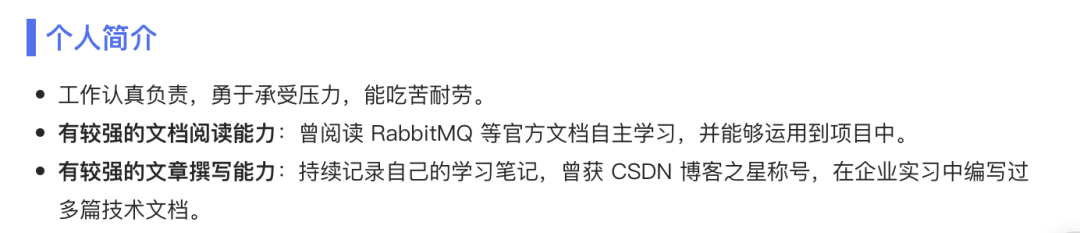 6、个人简介如图: ![]() 个人简介一般是放到简历的最后,可有可无。如果要写的话,避免 “自吹自擂” 的话,而是要通过事例来证明自己拥有某个能力,最好还是企业招聘信息中明确要求的能力。比如这位同学说自己写文章的能力强,并且通过自己得过 CSDN 博客之星称号来证明,就是不错的。