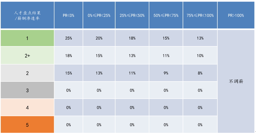 ◎表2. 素质模型分级描述示例 第二步:构建面向未来、尊重历史的调薪机制,以时间换空间。 即便强调了能力薪酬的价值,且经过了对于外部人才的精细评估,但选人时的判断偏差在所难免。很多时候,因为人才市场的竞争性因素,企业高薪引入并不完全匹配的外部人才是无奈之举。这个时候,只要有动态的薪酬调整机制,短期的不公平、不合理现象,就能随着时间的推移而逐步解决。 除了岗位调整或晋升,薪酬调整所应依据的基本要素有两个,一个是员工的薪酬现状,另一个是员工的能力与贡献综合评估结果。 考虑薪酬现状,是在尊重历史的基础上,再建立将遗留问题逐步解决的机制,让那些偏低或偏高的薪酬回归到相对合理的水平。但公平不是绝对的同等水平,而应该是建立在能力与业绩表现之上,所以,要考虑的另一个重要因素就是能力与贡献的综合评估结果。 表3是基于薪酬渗透率(代表薪酬现状)和人才盘点结果(代表能力与贡献)的调薪矩阵。 当某位员工甲,薪酬偏低,处于薪酬体系中的25到50分位,且人才盘点结果较好,在人才盘点九宫格中的定位为1类(明星人才),则其调薪幅度可以达到18%。另一位员工乙,与员工甲为同一岗位,原薪酬水平较高,处于50到75分位之间,且人才盘点稍低,定位为2+类(优秀人才),其调薪幅度显然会更小,只有11%。还有一位员工丙,虽然比员工甲的薪酬水平更低,处于0到25分位之间的位置,但因人才盘点定位为2类人员(普通贡献者),其调薪幅度为13%,低于员工甲。 ◎表3. 调薪矩阵表示例 通过调薪矩阵,一方面解决因历史遗留问题产生的薪酬不公平,将偏高的薪酬与偏低的薪酬都拉到正常的水平上,另一方面,就是解决高薪酬新员工到来而产生的薪酬倒挂现象。 新员工加入时,其能力水平只是通过面试等手段的初步评估,而业绩贡献尚未体现,随着任职时间的延长,公司会通过人才盘点的方式对其给予更加客观真实的评价。 一方面,那些能力被高估的新人会在人才盘点时被给予更真实的评价,另一方面,其比大多数同岗位偏高的薪酬,会在薪酬调整时因调薪矩阵的存在而被放慢加薪的节奏。经历过几次调薪之后,薪酬倒挂会逐步缓解,无论新人是真材实料还是徒有其表,最终其对应的薪酬水平都和其他员工一样,进入到更加符合其能力与贡献水平的轨道上。 更进一步,除了建立上述调薪机制,薪酬管理团队应该做更具体的计算,预测薪酬偏低的优秀老员工,可以通过几次调薪,能够与新人薪酬对比更加公平。 如上述例子中,假设甲为一个优秀老员工,薪酬水平为5000元,乙为新加入员工,薪酬水平为6000元。再假设其每次盘点结果定位与薪酬所处分位值不变(仅为了模拟计算方便)。则经过三次,即可将甲乙两位员工的薪酬拉到同一水平线。 ◎表4. 员工调薪模拟对比表 表4所展示的人才盘点结果,由员工素质与业绩两个维度来评判,以人才盘点九宫格进行定位(如图1)。但人才盘点结果的获取,应该通过严谨的评价、校准过程,使其最大程度与员工实际表现吻合。 ◎图1. 人才盘点九宫格 除了构建能力导向的薪酬认知与基于调薪矩阵的调薪机制,企业还有一项基础工作需要完成:薪酬保密。 上述机制的建立,能减少薪酬不公平感,但无法完全杜绝,总有人因为自我认知与对规则认知的不到位,而对公司心生不满。 所以,通过薪酬保密管理机制,最大限度减少员工对于不完整、不准确信息的接触,是解决员工不满的另一举措。 但薪酬保密并不是完全的信息不透明,而是避免私下臆测式的讨论,将完整、准确的薪酬规则通过正常渠道传递给员工。 华为内部有个说法,“不让雷锋吃亏”,真正做到不让雷锋吃亏,关键要有落地的机制与方法,让所有员工看到公平、合理的希望与前景。以时间换空间的调薪机制,就是不让雷锋吃亏的具体举措之一。(正文完) 薪酬调整,是每一位HR的必修课! 如何调、怎样调、调多少,这都需要HR有足够的技巧和策略去平衡、去协调、去控制。对于HR来说,如何在企业需求和员工利益之间找到平衡点,如何科学合理的制定薪酬规划,是一项非常具有挑战的工作。 如何搭建全面薪酬体系、奖金体系、预算与调薪管理?通过调薪矩阵,解决薪酬倒挂的问题,也是HR要掌握的一项技能; HR新逻辑线下实操课《全面薪酬体系、奖金体系、预算与调薪管理实战班》火热报名中......2天1晚深度系统学习,成为薪酬激励设计实操高手! 3月22-23日上海开课 2天1晚,线下系统学习 2024年唯一一期,错过无! 名额抢购中,小班,满员封班! 课程特色 课程核心收益 课程大纲 讲师介绍 - 翁老师 - HR新逻辑实战导师 - 薪酬绩效管理实战专家 - 人才发展实战专家 - 原宝马集团亚太区薪酬负责人 翁涛老师现任国内某互联网独角兽公司内部管理顾问、在国际著名咨询公司担任高级项目顾问、从事人力资源管理工作近30年,既有企业内部人力资源管理实战经验,又有咨询公司人力资源管理咨询经历。 工作于多家大型外资企业、国企、民企、咨询公司(例如:中国网通、宝马集团、施耐德电气、 TCL 集团、 Hay 集团等等),主管中国区、亚太区薪酬福利、业绩管理、人才管理等工作。 北京理工大学特聘讲师十多年,多部畅销书作者: 著作: 《 薪酬总监修炼笔记:我在世界 500 强公司管薪酬 》 著作: 《 奖金体系设计 》 著作:《薪酬专家都是Excel高手》 译著: 《 人力资源管理大变革 》 本套课程