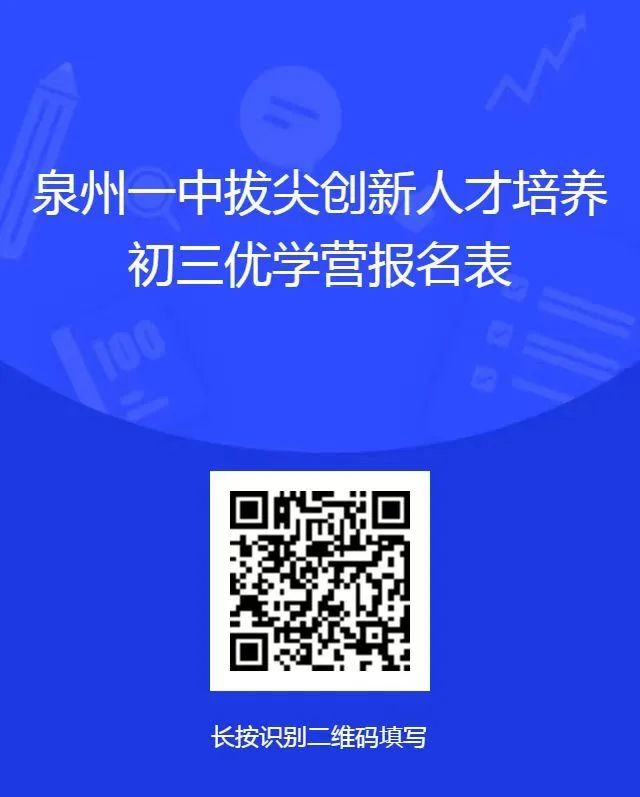 拔尖创新人才培养初三优学营采取线上自愿报名,学生及家长可通过下面的表单链接报名,泉州一中将对报名材料进行审核,择优录取。(扫描以下二维码)