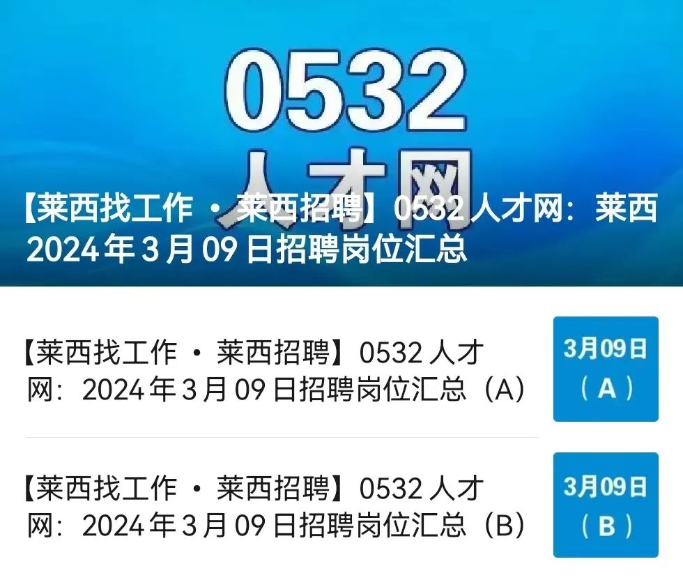 【莱西找工作•莱西招聘】0532人才网:莱西2024年3月09日招聘岗位汇总