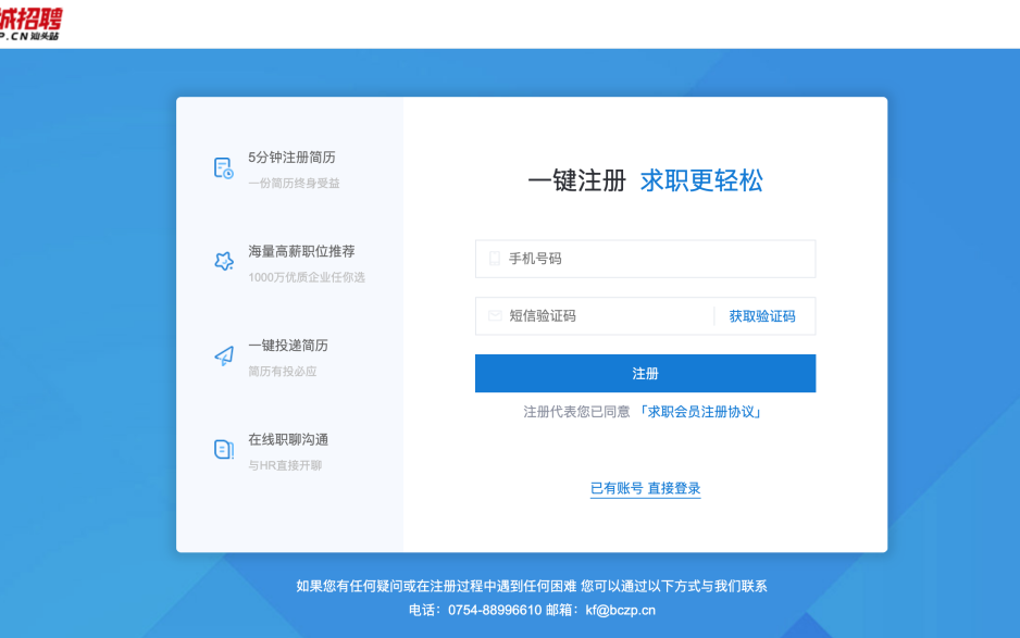 1、登录“百城招聘”(st.bczp.cn),点击“2024年潮南区‘百千万’工程‘南粤春暖’网络招聘会”广告位,再选择“注册简历”进入登录/注册界面。
