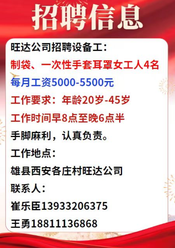 >旺达公司招聘:设备工,制袋、一次性手套耳罩女工人4名