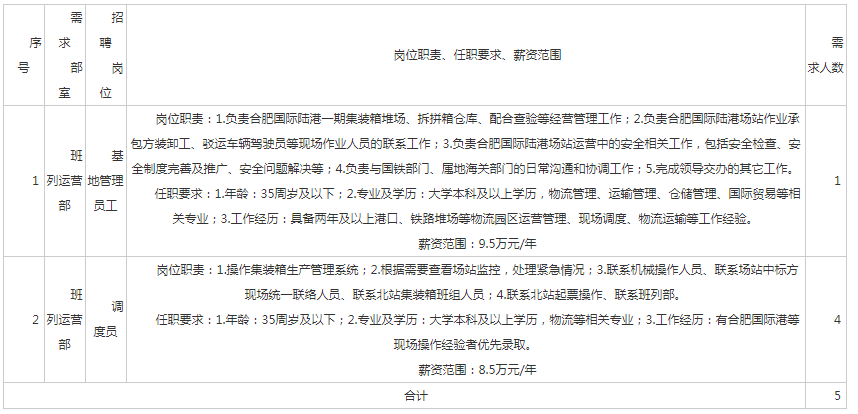 为满足公司快速发展需要,选拔优秀人才、完善人才队伍建设,根据合肥国际陆港发展需要,现面向社会公开招聘5名工作人员。具体招聘事项公告如下: