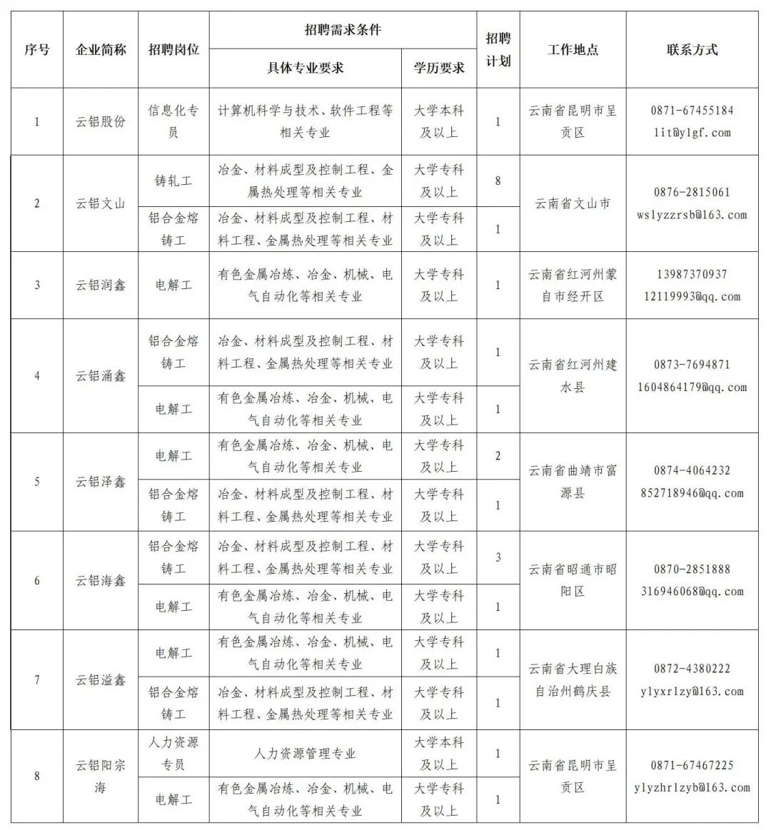 当前,公司正在着力延链补链强链,积极推进基地经济发展,至2025年,将打造“3+3”六大绿色铝材一体化产业集群/基地(红河州、曲靖市、昭通市3个百万吨级产业集群,昆明市、文山州、大理州3个百亿级产业基地),力争全产业链产值达到1500亿元,招商引资集聚发展拉动产值1500亿元,实现原铝100%就地转化,形成从铝水到终端产品的“1+N”全产业链绿色发展格局。处于高速发展的云铝,期待优秀人才的加入。