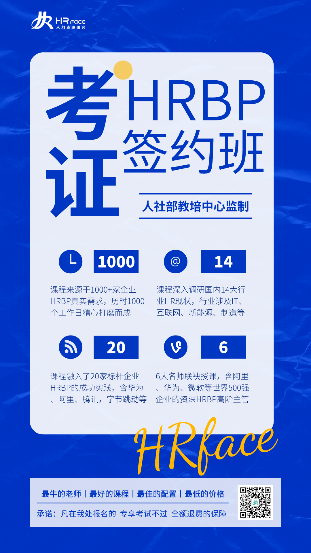为培养出一批合格的HRBP人才,支持国家经济发展,人社部直接出手,责成其教培中心组织开展HRBP职业培训课程。课程由人社部教培中心主导,从项目立项、全国教师甄选、课程体系建设、课程评估、上线测试、课程服务、考试系统等等都亲自严格把关。其颁发的HRBP证书,是国内人社系官方BP证书,具有相当高的影响力,认可度极高!官方背书