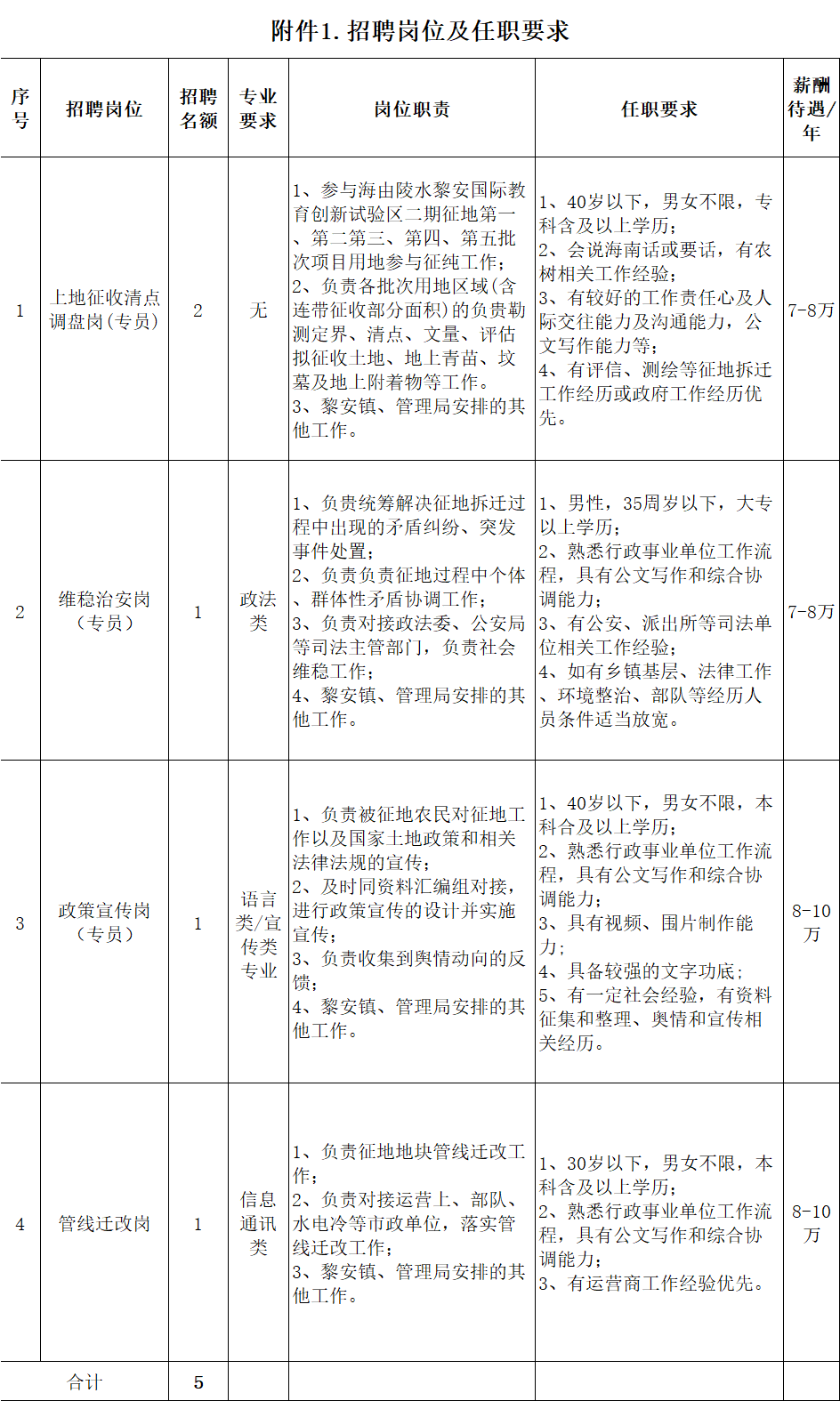 土地征派驻人员,共招聘5名,岗位具体内容详见招聘岗位职责和任职要求、薪酬待遇(附件1)。