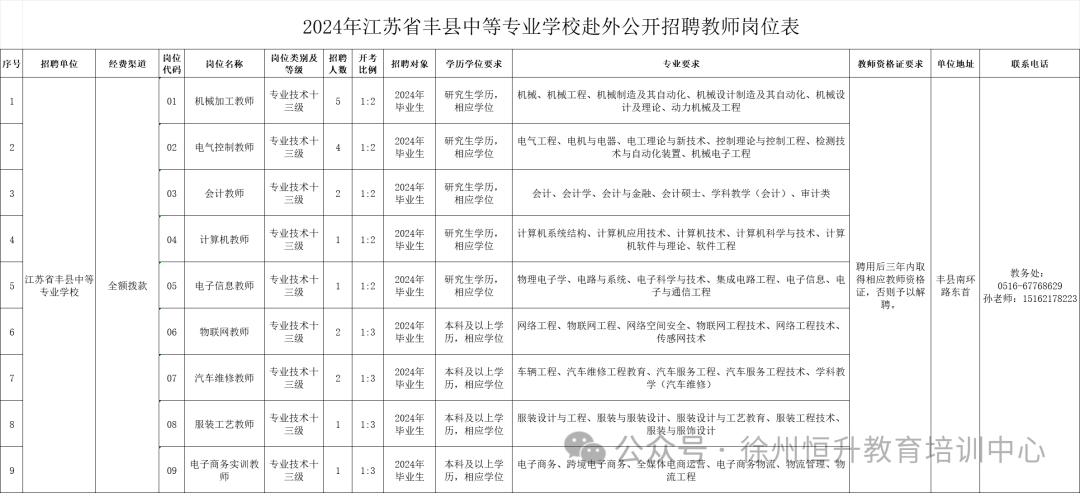 公开招聘教师公告、岗位信息在徐州市人力资源和社会保障局官网(http://hrss.xz.gov.cn)、丰县人民政府网“丰县人事考试”系统(http://218.3.233.8:8181/Default)和江苏省丰县中等专业学校网站(https://www.fxzdzyxx.cn/)发布,具体的岗位名称、招聘人数、资格条件等详见《2024年江苏省丰县中等专业学校赴外公开招聘教师岗位表》(以下简称《岗位表》)。