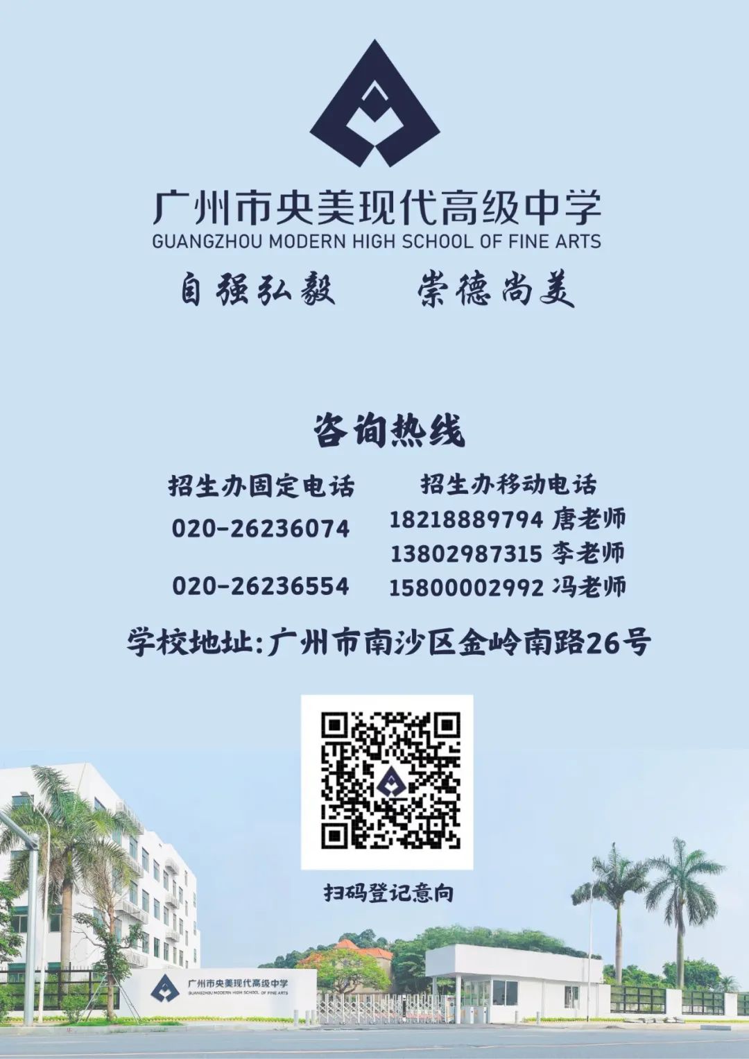 广州市央美现代高级中学(广州市南沙区金岭路 26 号,四号线广隆站步行10分钟)。