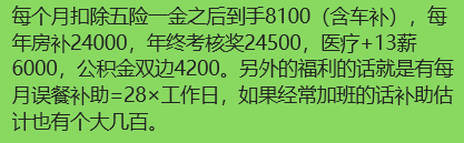 此外,每月还有误餐补助=28×工作日,加班多的话补助也会增加。