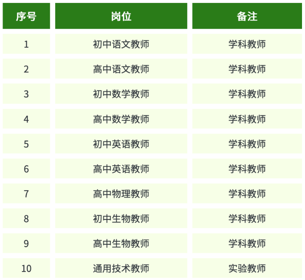 初中部:语文4名、数学4名、英语6名、物理2名、化学1名、政治2名、历史2名、生物2名、地理2名、体育2名。