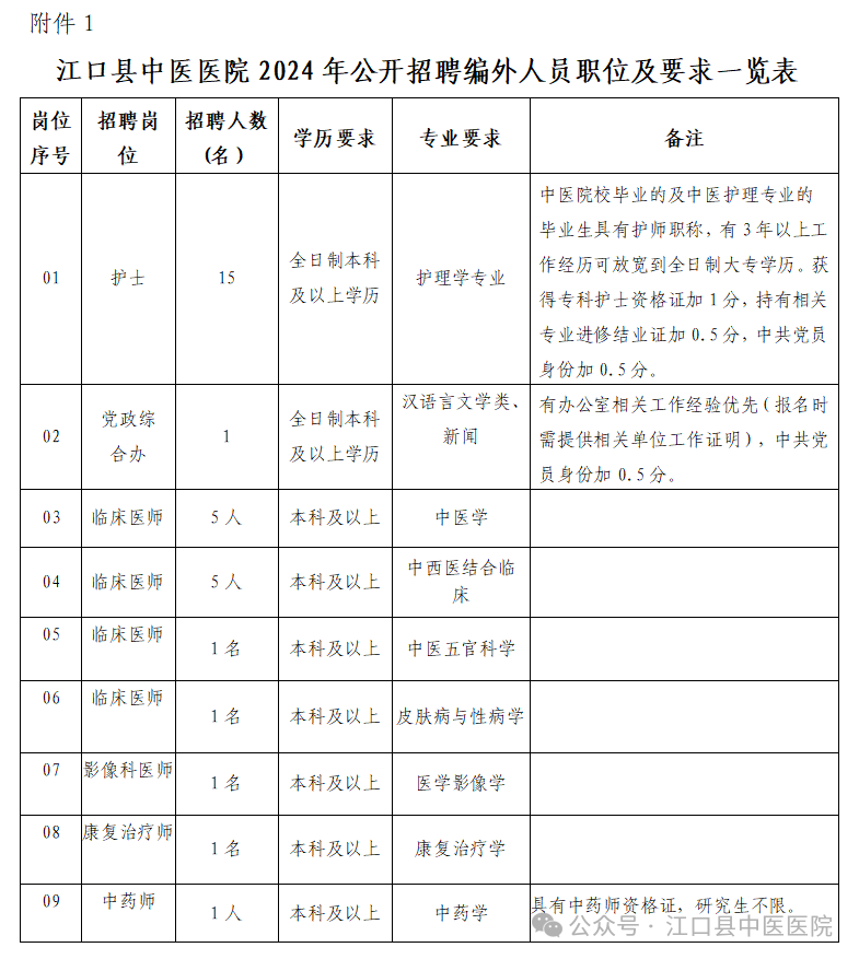 具体招聘职位及相关要求详见附件1:《江口县中医医院2024年公开招聘编外人员职位及要求一览表》