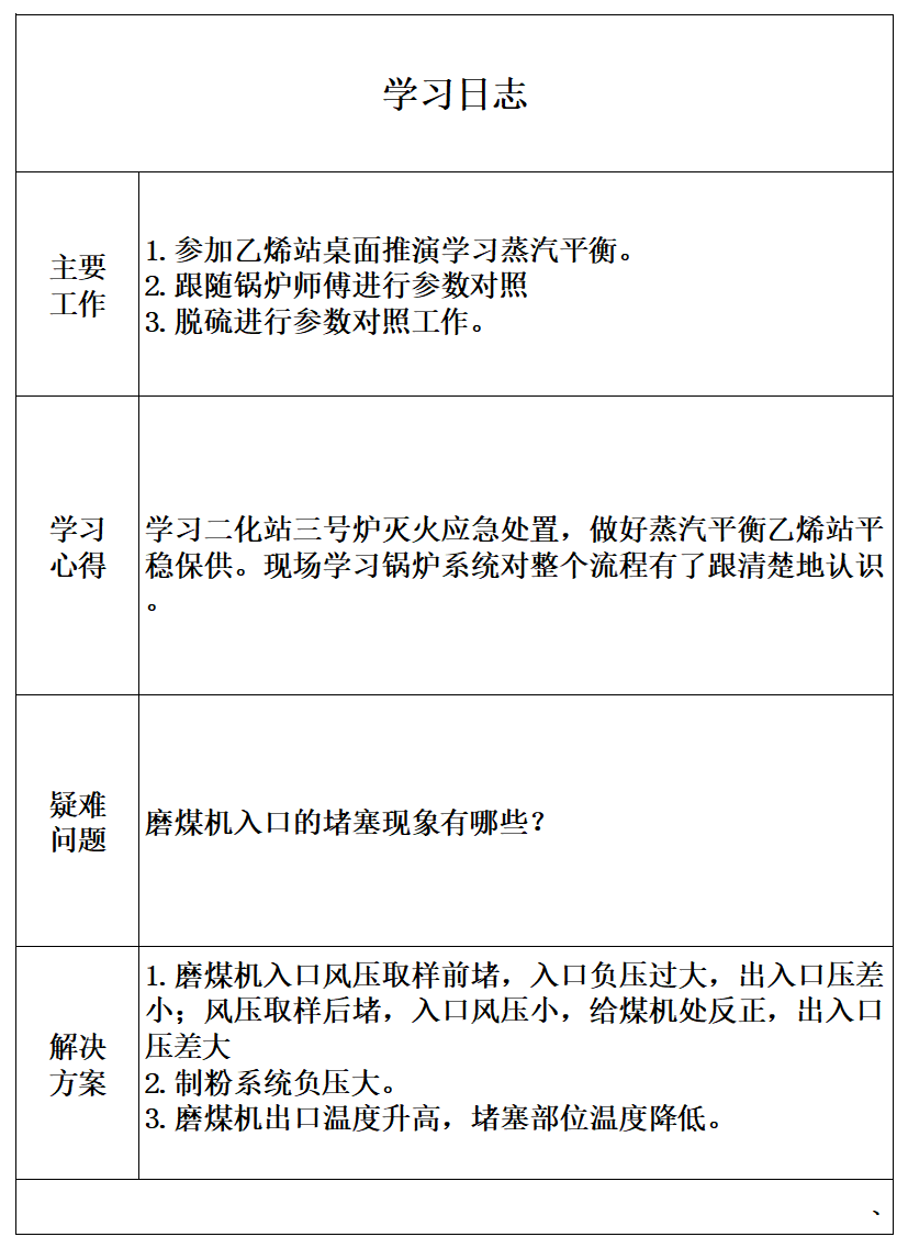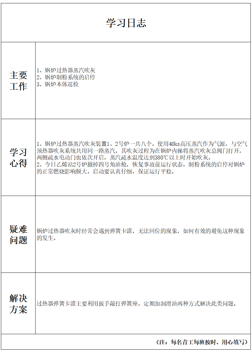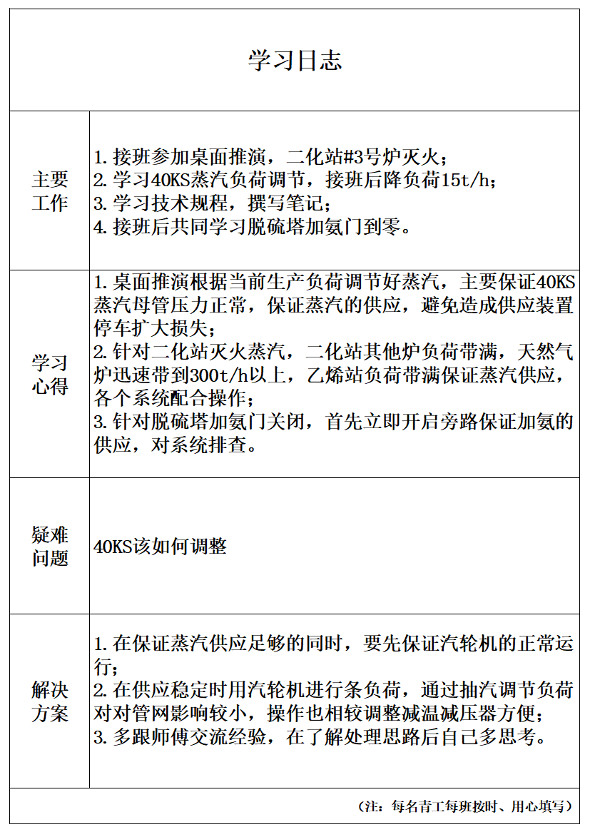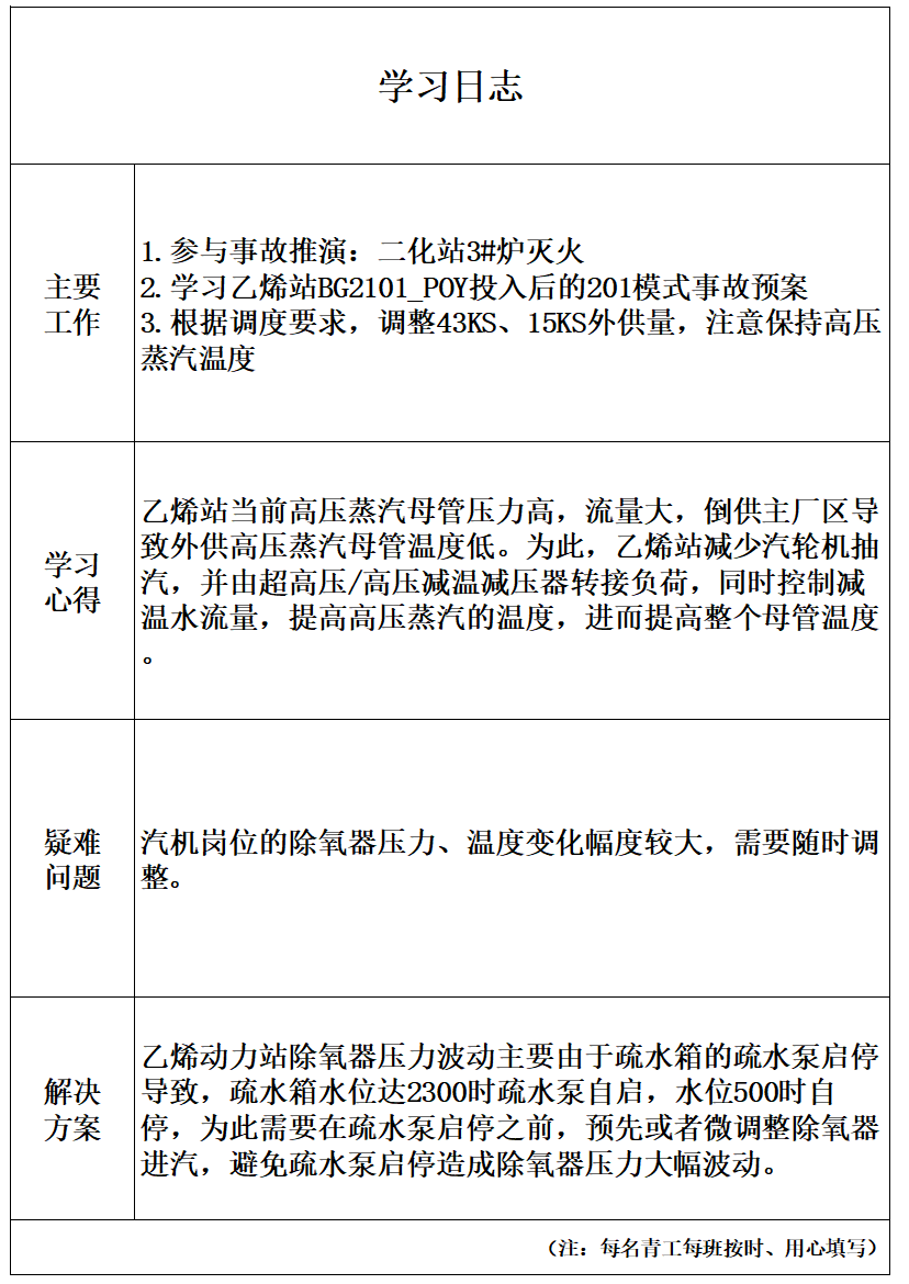 ✔ 驻岗人员坚持填写学习日志,积极协助完成乙烯动力站日常工作,继续以“精一懂二会三”为目标,持续汲取营养,提升自身能力。