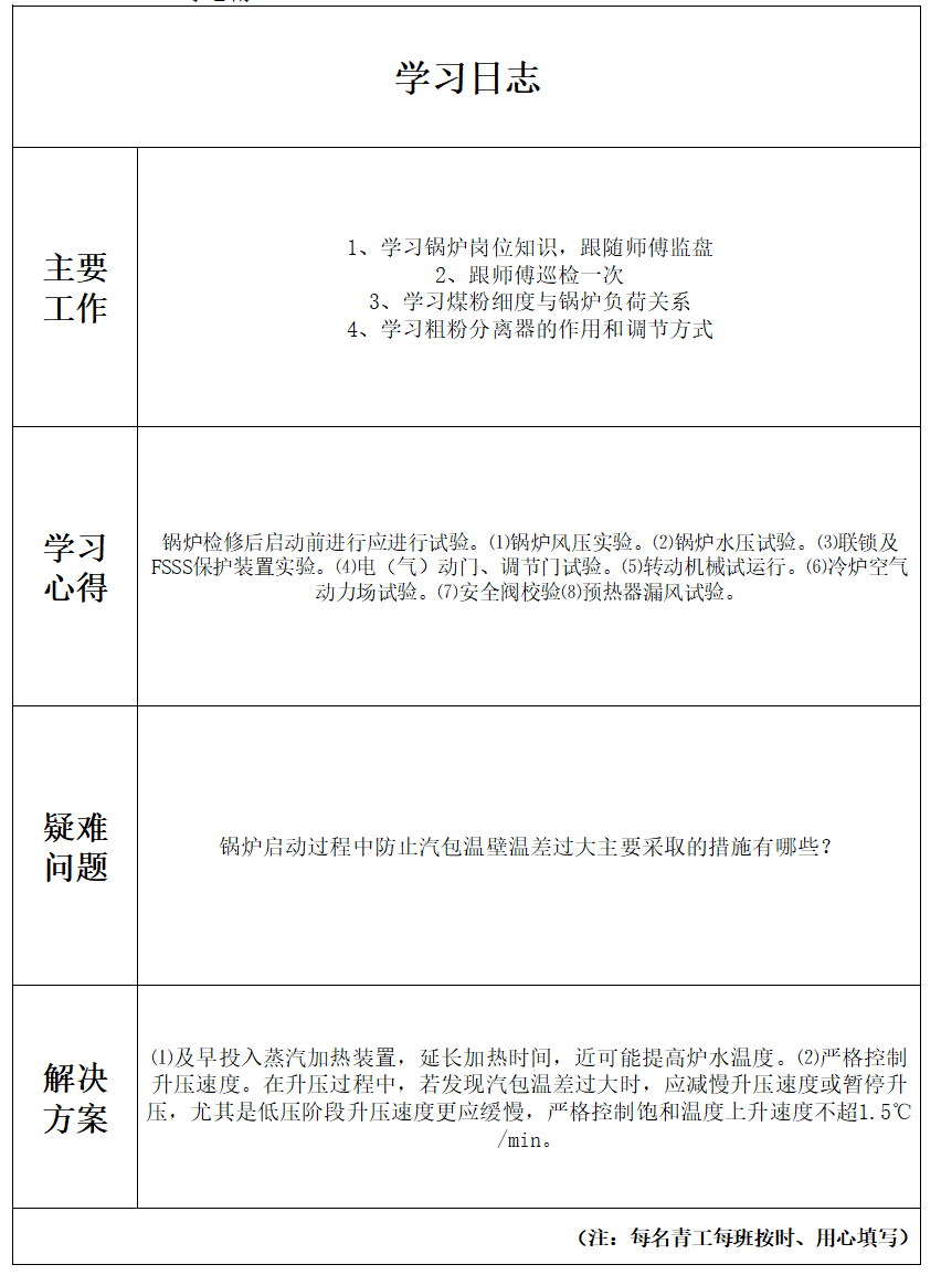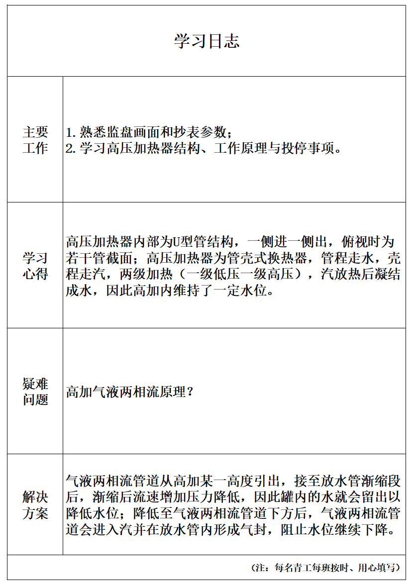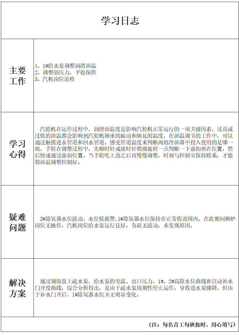 ✔ 驻岗人员坚持填写学习日志,积极协助完成乙烯动力站日常工作,继续以“精一懂二会三”为目标,持续汲取营养,提升自身能力。