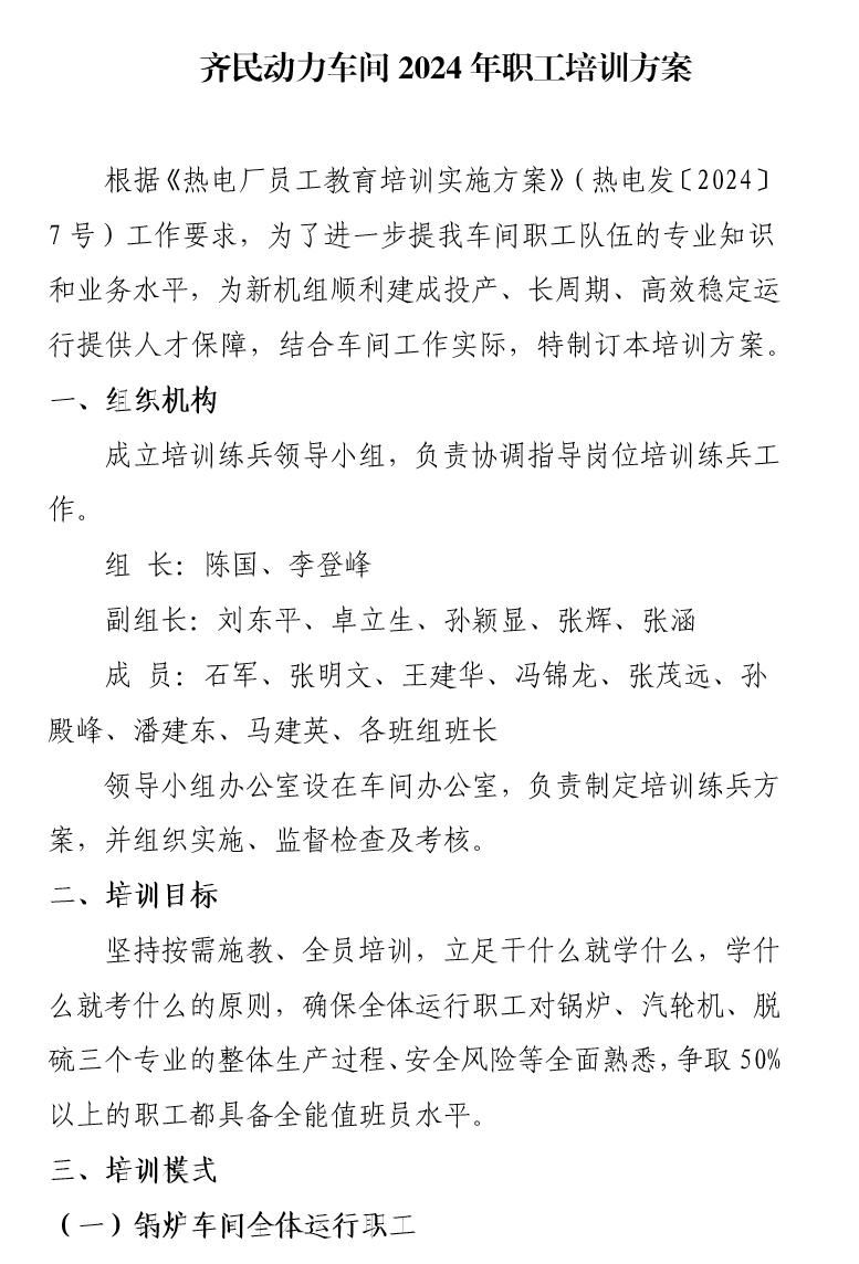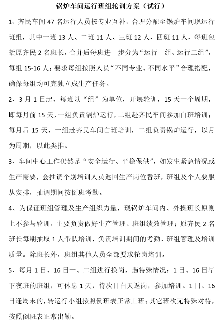 根据总体培训方案,与锅炉车间共建共享,将人员按专业互补方式融入运行班组,在保证生产运行力量的前提下一分为二,一半保障生产一半参训学习,边工边学,兼顾平稳保供和职工培训全覆盖。