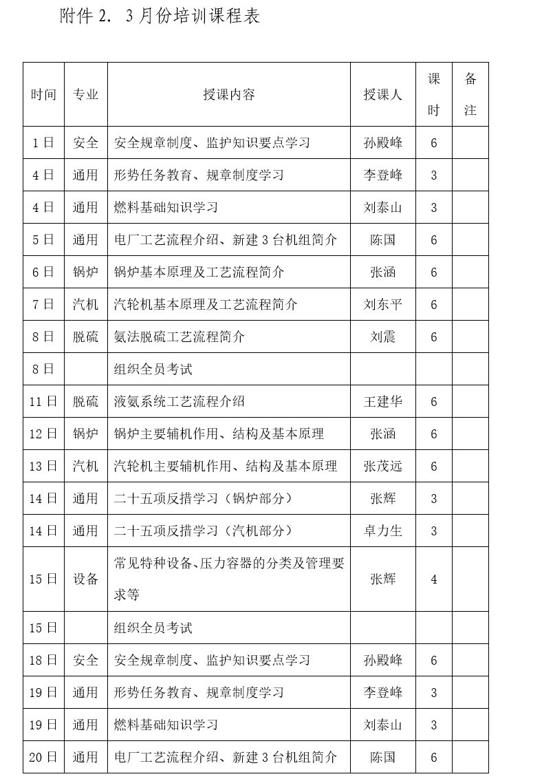 建立培训练兵领导小组,要求各分管领导和专工根据自身专业提前准备授课内容和课后复习题,合理分配各专业授课比例,保证全体运行职工在专攻本专业的基础上,对锅炉、汽轮机、脱硫专业的工艺流程、设备特性、安全风险、法律法规等全面认识与熟悉,附加电气、仪表、健康等公共知识,边精边兼,争取50%以上的职工都具备全能值班员水平。