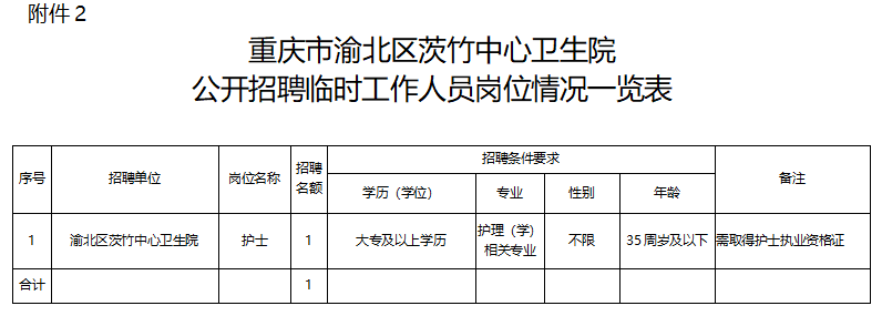 本次以劳务派遣的方式招聘1名临时工作人员(具体岗位见附件2:重庆市渝北区茨竹中心卫生院公开招聘临时工作人员岗位情况一览表)。