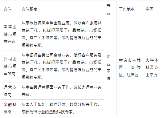 零售金融市场营销岗、运营支持岗、金融科技岗等若干人