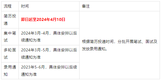 (一)简历投递截止日期:2024年4月10日,我行将根据简历投递时间分批开展笔试、面试及发放录用通知。