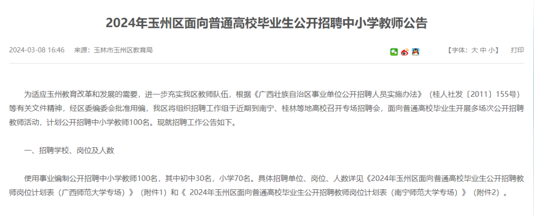 使用事业编制公开招聘中小学教师100名,其中初中30名,小学70名。具体招聘单位、岗位、人数详见《2024年玉州区面向普通高校毕业生公开招聘教师岗位计划表(广西师范大学专场)》(附件1)和《 2024年玉州区面向普通高校毕业生公开招聘教师岗位计划表(南宁师范大学专场)》(附件2)。