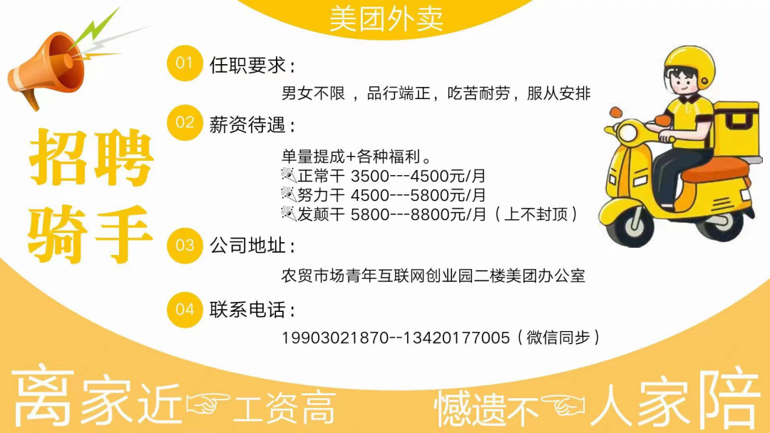 >徐闻美团外卖,招送餐骑手(全职骑手、兼职骑手)多名、商务拓展(BD)1名,薪资待遇:4500-10000元起!