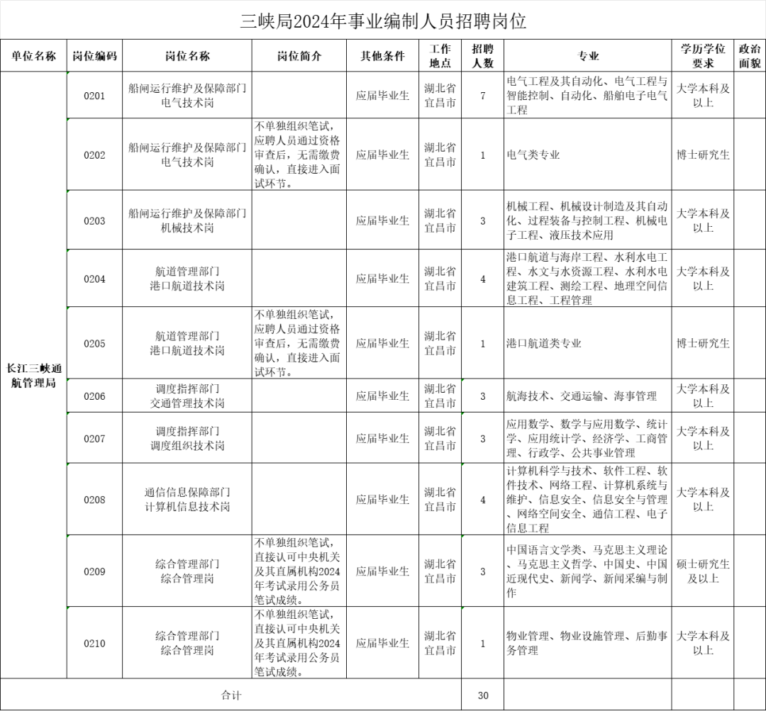 根据工作需要,三峡局现公开招聘事业编制工作人员30名,具体岗位详见附件《三峡局2024年事业编制人员招聘岗位表》。