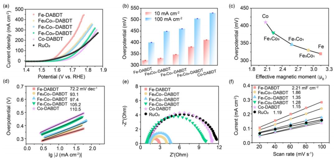 对所制备得到的催化剂使用三电极体系在1M KOH中进行了OER活性测试。进行iR校正后的LSV测试(图3 a,b)表示Fe-DABDT具有最低的过电位且同电位下电流密度远高于商用RuO2,随着Co含量增加,OER活性降低。催化剂活性与金属中心的自旋单电子数以及有效磁矩呈正相关(图3 c),说明活性轨道的自旋单电子有助于增强与反应物的自旋交换,提高反应动力学,Tafel斜率的计算(图3 d)以及电化学阻抗测试的结果(图3 e)都证明了这一结论。结合电化学测试结果以及ECSA测试结果(图3 f),我们发现Fe-N2S2位点比Co-N2S2位点具有更高的内在活性,进一步证明活性轨道中存在一个有效的自旋单电子,可以加速与OH进行的自旋交换,从而提高催化剂的催化活性和反应动力学。