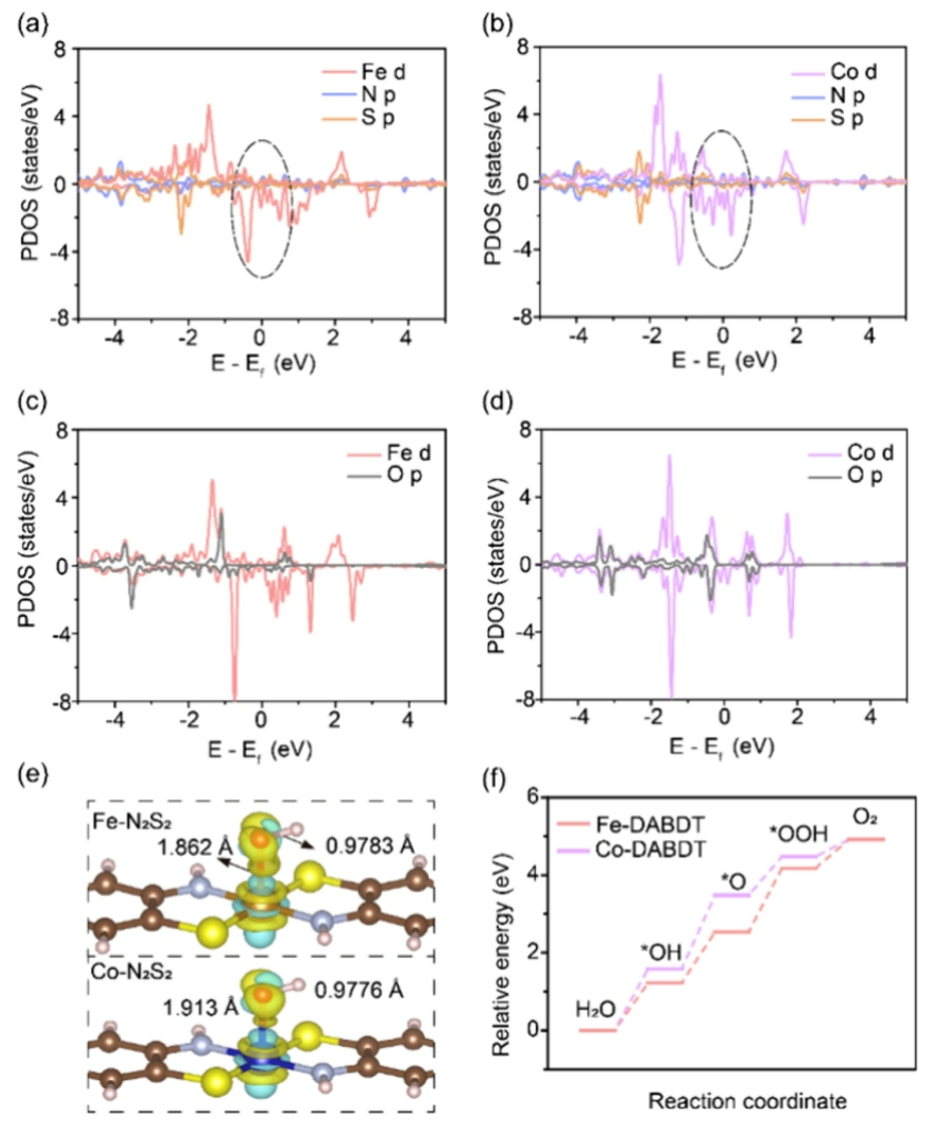 利用DFT计算进一步研究Fe-DABDT在OER过程中的活性来源,PDOS计算结果(图4 a,b)表明催化剂具有良好导电性,且Fe中心比Co中心更具有QSEI活性。Fe和Co的3d轨道以及OH的p轨道的PDOS计算结果(图4 c,d)显示出Fe-DABDT的d轨道和OH的p轨道在费米能级附近有很强的自旋耦合相互作用,有利于电子的快速交换,同时促进OH的吸附和OER反应发生。*OH在催化剂上的差分电荷密度(图4 e)表明Fe-N2S2位点的电子自旋性质有助于O-H键的裂解。