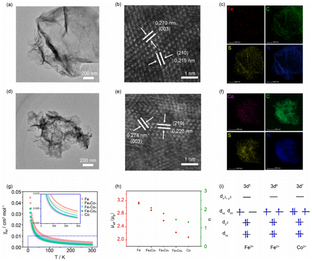 图2 Fe/Co-DABDT的TEM、HAADF-SEM表征以及磁化率和价电子构型