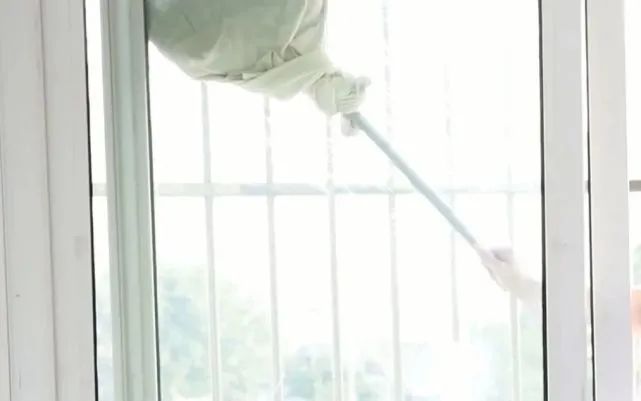 还要提醒大家在擦拭外侧玻璃的时候一定要注意安全,扫把上面的袜子咱们一定要将其套牢,不要掉下去,人也不要探出窗户外侧,安全为重。