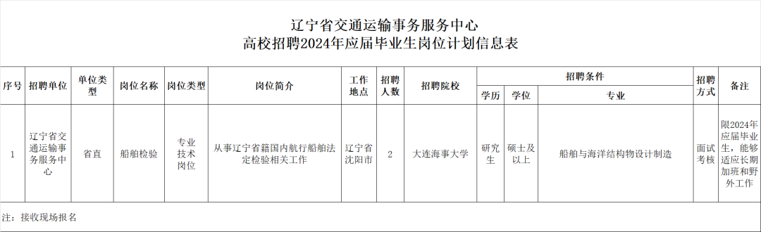 ↓↓↓ 一、招聘对象 符合招聘基本条件和招聘岗位具体资格条件的2024年全日制硕士及以上研究生应届毕业生,不包括往年毕业但未派遣的毕业生。 二、招聘基本条件 (一)具有中华人民共和国国籍, 且无国(境)外永久居留权。 (二)拥护中国共产党领导和社会主义制度,遵纪守法,自觉践行社会主义核心价值观,爱党爱国,有理想抱负和家国情怀,甘于为国家和人民服务奉献。 (三)品学兼优,作风朴实,诚实守信,吃苦耐劳,有较好的沟通协调能力,服从组织分配。 (四)2024年全日制硕士研究生应届毕业生需在2024年1月1日至7月31日取得毕业证、学位证,博士研究生需在2024年12月31日前取得毕业证、学位证。年龄在35周岁及以下(1989年7月及以后出生)。 (五)具有正常履行职责的身体条件和心理素质。 (六)岗位所需要的具体条件详见附件。 曾因犯罪受过各类刑事处罚,有犯罪嫌疑尚未查清或正在接受纪律审查的,国家法律法规规定不得聘用的其他人员,均不得报考。 三、招聘方式 招聘采取考核方式。 四、招聘工作程序 (一)发布招聘信息 招聘人员岗位信息在所招聘院校校园网站上统一发布。 (二)报名 报名时间:2024年3月7日至3月12日。 报名方式:采取网络报名的方式,进行简历投递,并填写报名表(见附件2)。 简历投递邮箱:fwzxrsz@163.com 报名实行诚信承诺制度,报名者填报的信息应真实有效,如发现材料虚假者随时取消其应聘资格。 (三)资格初审 按照公告及岗位资格条件,对应聘毕业生报名资格进行审查确认。 (四)面试考核 根据报名及资格初审情况,确认进入面试考核人员名单,并与所在高校就业指导部门、院系及本人联系,通知面试考核相关事宜。面试考核时间拟定为3月中旬,面试重点考察专业素养和分析解决问题等能力,面试工作具体事宜另行通知。 (五)组织考察 辽宁省交通运输事务服务中心向学校发布考察公告,并组成考察工作组赴高校开展考察工作,主要通过查阅档案、与人选面谈、向有关人员了解情况等方式,客观全面考察了解人选的政治品质、思想道德、学业水平、心理素质、组织协调能力、遵纪守法和发展潜力等情况。按照有关政策对考察对象的档案进行严格审核,重点审核提供的报考信息和相关材料是否真实、准确,是否符合规定的报考资格条件等内容。 (六)体检 统一组织在具有公务员考录和事业单位公开招聘体检经验的三级甲等医院进行体检。 体检工作参照《关于修订<公务员录用体检通用标准(试行)>及<公务员录用体检操作手册(试行)>的通知》(人社部发〔2016〕140号)、《关于切实做好维护乙肝表面抗原携带者入学和就业权利工作有关问题的通知》(人社厅发〔2010〕22号)、《关于进一步做好公务员考试录用体检工作的通知》(人社部发〔2012〕65号)等有关规定组织实施。 应聘者对体检结论有疑问要求复检的,可在接到体检结论的7日内,以书面形式向我单位提出。另有规定的,从其规定。复检将在应聘者提出申请的7个工作日内安排。复检内容为对体检结论有影响的项目,复检只能进行一次,体检结果以复检结论为准。 (七)签订就业协议 考察和体检合格后,辽宁省交通运输事务服务中心与毕业生在双方自愿的基础上签订就业协议。 (八)公示与聘用 拟聘人员信息将统一在辽宁省交通运输厅官方网站(https://jtt.ln.gov.cn)进行公示,公示期为7个工作日。公示结束后,对公示无疑义人员办理备案手续。对于公示有疑义的人员,我单位将调查核实,并提出处理意见。校园招聘人员按规定实行试用期制度。试用期一般不超过6个月(初次就业签订3年以上聘用合同的,试用期为12个月),国家另有规定的按规定执行。试用期包括在聘用合同期限内。试用期满合格的,予以正式聘用;不合格的,取消聘用。 五、纪律与监督 校园招聘工作坚持“公开、平等、竞争、择优”的原则,严肃纪律,秉公办事,严禁弄虚作假,徇私舞弊,全程接受纪检监察部门和社会的监督。应聘者有弄虚作假、违纪违规行为的,一经发现,取消其应聘资格,并将有关情况通报其所在学校。具体事宜依照《事业单位公开招聘违纪违规行为处理规定》(人社部令第35号)执行。 六、其他 1.应聘毕业生自报名至拟聘用公示期间,应确保报名时所填报的通讯工具畅通,以便我单位联络,因所留通讯方式不畅所致后果,由应聘毕业生自负。 2.资格审查贯穿招聘全过程,一经发现应聘毕业生不符合报考岗位要求或弄虚作假的,随时取消应聘资格。 3.在拟聘人员正式公示前,因体检不合格、考察不合格、自愿弃权、弄虚作假被取消应聘资格及其他原因出现岗位空缺,我单位将统筹各高校面试人员综合情况,进行等额递补,递补只进行一次。 七、其他未尽事宜按有关文件规定执行 本公告最终解释权归辽宁省交通运输事务服务中心所有。 报名咨询电话:024-83211109 纪律监督电话:024-83210318 电话咨询时段(工作日):8:30-17:00 附件:1. 辽宁省交通运输事务服务中心面向部分“双一流” 高校招聘2024年应届毕业生岗位计划信息表 2. 辽宁省交通运输事务服务中心面向2024年应届毕 业生招聘报名表