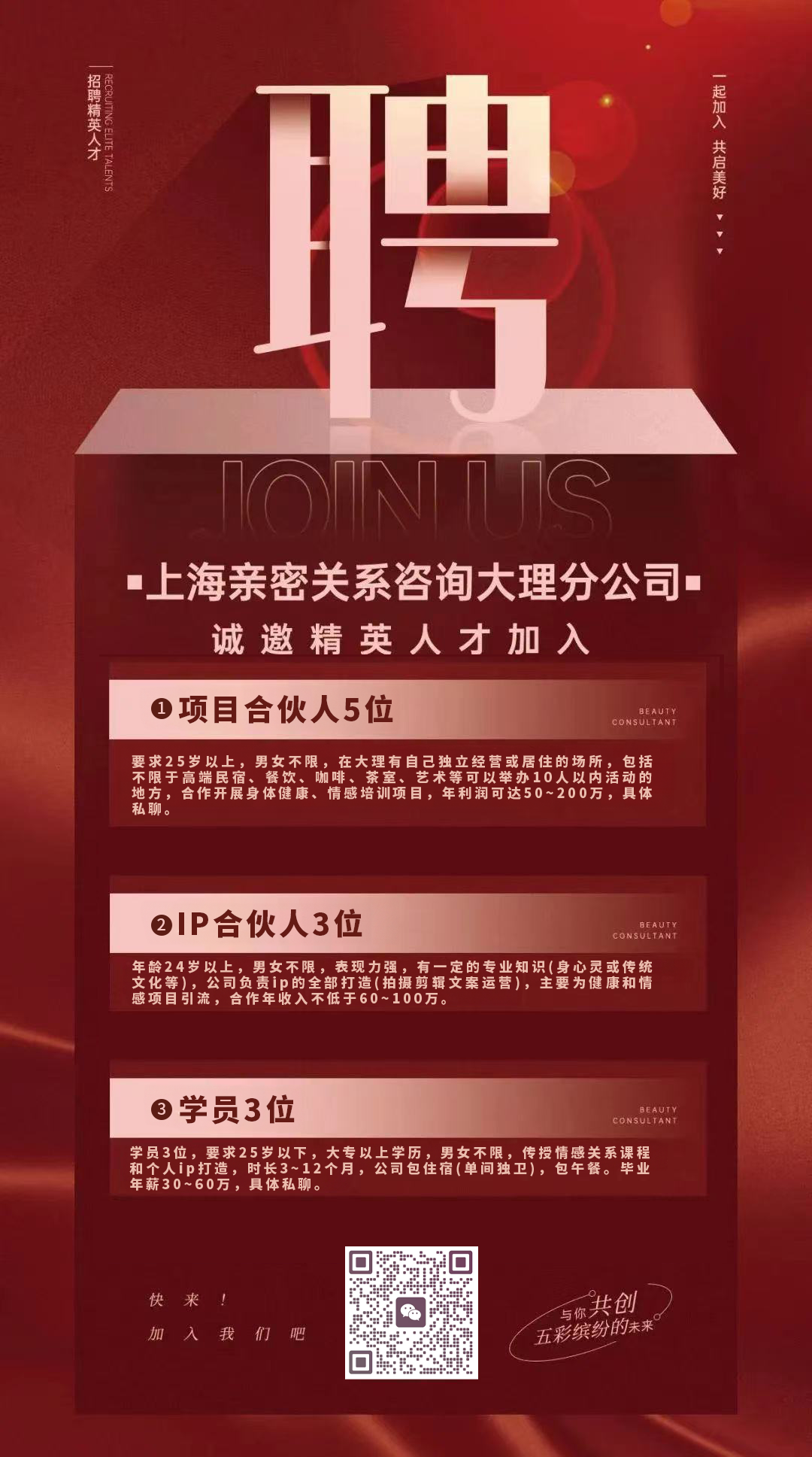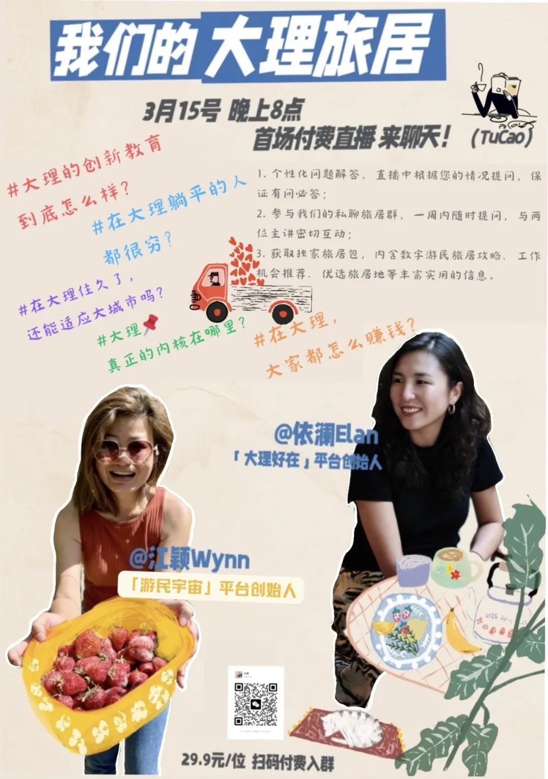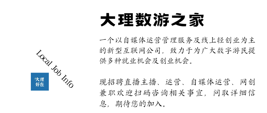 3月15号 晚8点 一起聊聊“我们的大理旅居” 1、在大理,大家都怎么赚钱? 2、在大理住久了,还能适应大城市吗? 3、在大理躺平的人,都很穷? 4、大理的创新教育到底怎么样? 5、大理真正的内核在哪里? 🌟 直播互动环节 个性化问题解答 直播中根据您的情况提问 有问必答 ✍️直播后互动 参与我们的私聊旅居群 一周内随时提问 与两位主讲密切互动 🎁福利礼包 获取独家旅居包 内含数字游民旅居攻略 工作机会推荐 优选旅居地等旅居干货信息 💬扫描海报中二维码 加小助手付费后即可入群! ✨✨ 发布 工作岗位、房源信息、 店铺推广、个人自荐 请加旅居助理微信 业务&合作 品牌活动 | 在地游学 云南好物|中小企业营销 策划咨询|新媒体运营 扫码加小编 1.“大理好在”目前发布的招聘类信息,都由招聘人/机构提供,海报、招聘详情原文转发。相关招聘职位、薪资待遇、及其它相关信息,仅代表原作者个人观点,不代表“大理好在”公号立场。2.原文中所使用的图片、文字、视频、音频等,如有版权问题,还请与招聘主体联系,“大理好在”不承担任何相关责任。3.“大理好在”会要求招聘主体提供联系人及联系方式,应聘人敬请自行咨询。4.招聘信息的真实性由招聘主体负责、招聘与应聘双方产生之任何法律、财务、劳动纠纷,均由双方自行负责。“大理好在”仅发布信息,不承担任何相关责任。 |