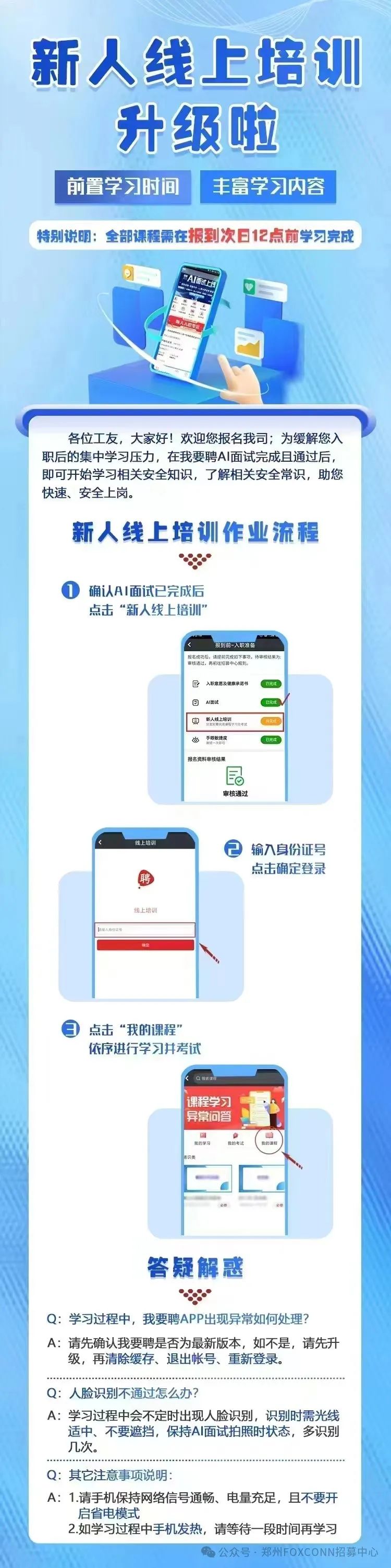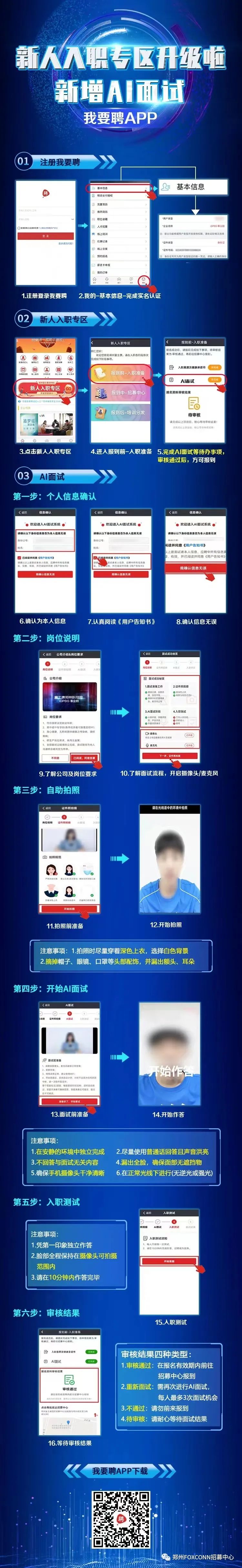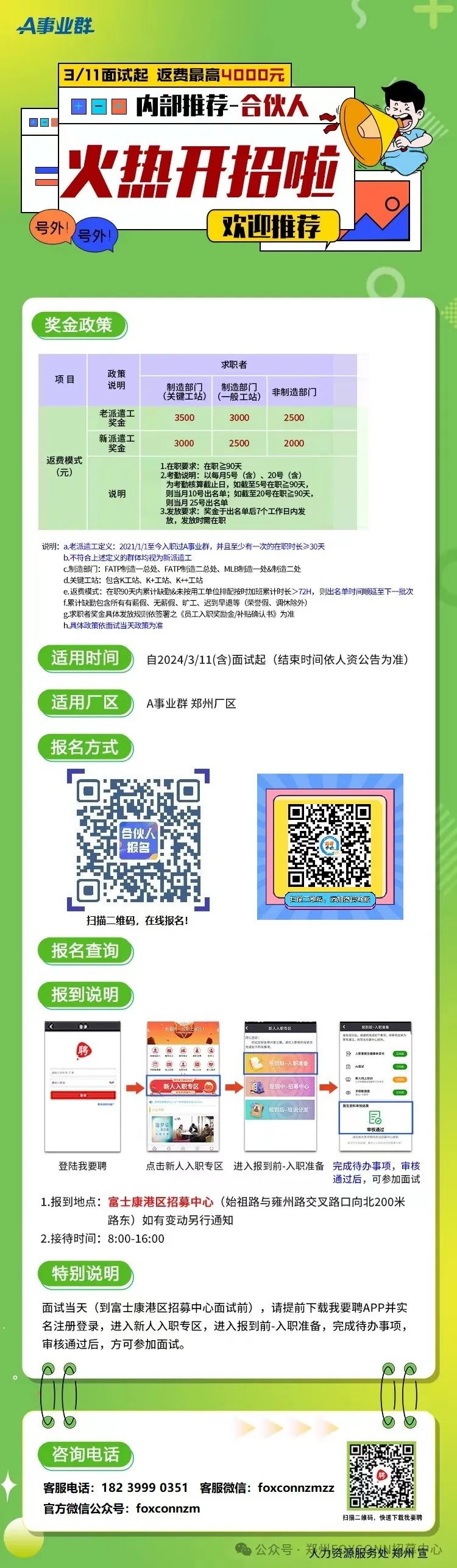 郑州港区富士康A事业群(原iDPBG)火热招募中派遣工返费最高3500元名额有限,报名从速!A事业群“返费工”招募政策(具体面试时间依公司短信通知为准)【重要】新人入职线上Ai面试作业说明《郑州富士康》Ai面试流程▼《郑州富士康》新人线上培训流程▼大家都在看☞【行政】常见考勤问题解读☞【行政】最全请假攻略☞【行政】薪资相关20问☞【行政】居住证办理问题解答☞【招聘】郑州富士康“返费工”在线报名入口▼点击"阅读原文",即可在线报名!