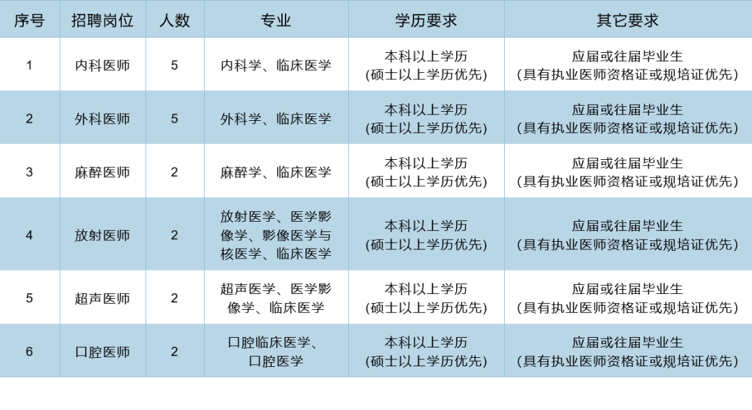 6.临床医师、医技人员要求35周岁以下;硕士研究生及以上学历者,年龄可以适当放宽;